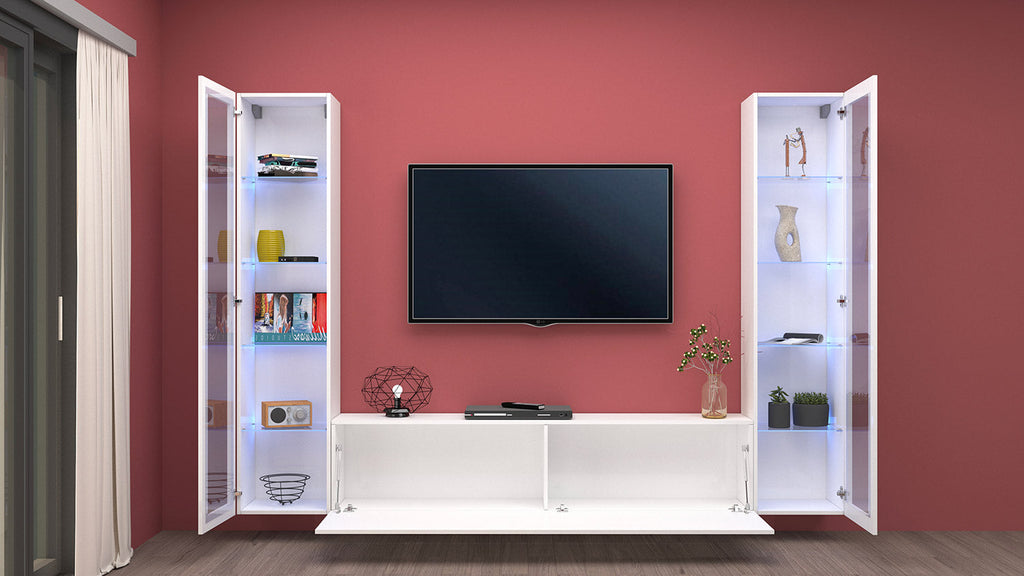 Il soggiorno MARUSKA n°12 è una parete, montabile sia a terra che sospesa, composta da 2 vetrine e 1 porta TV. La vetrina ha 1 anta a telaio con vetro e 4 ripiani all’interno, anch’essi in vetro. Il porta tv si caratterizza da un’anta a ribalta regolata con bracci a gas. La parte frontale della vetrina e la struttura del porta TV sono realizzati in melaminico bianco laccato lucido. Viene fornito in un kit di montaggio con istruzioni chiare e dettagliate e il suo stile è in grado di adattar si a una varietà di tipologie diverse di arredamento.