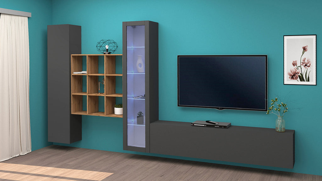 Il soggiorno MARUSKA n°24 da 350 cm è caratterizzato da una parete con 1 colonna armadio, 1 vetrina, 1 mobile porta tv, 1 vasistas e una libreria 9 vani. La colonna armadio è composta da 1 anta battente, con all’interno 4 ripiani in legno. La parete del soggiorno può essere montata sia a terra che appesa. Il mobile porta tv e la vasistas hanno, il primo 1 anta ribalta e il secondo 1 anta vasistas, entrambe regolate con dei braccetti a gas. Può essere montato sia a destra che a sinistra. Tutti i mobili che compongono il soggiorno sono realizzati in melaminico bianco laccato lucido o antracite opaco, eccetto la libreria, caratterizzata dal legno rovere wotan. Il soggiorno MARUSKA n° 24, è adatto a qual sia si tipo di arredamento, facile da inserire grazie alla sua forma ultra moderna. La confezione è dotata un kit di montaggio con istruzioni da seguire anche per i non esperti.