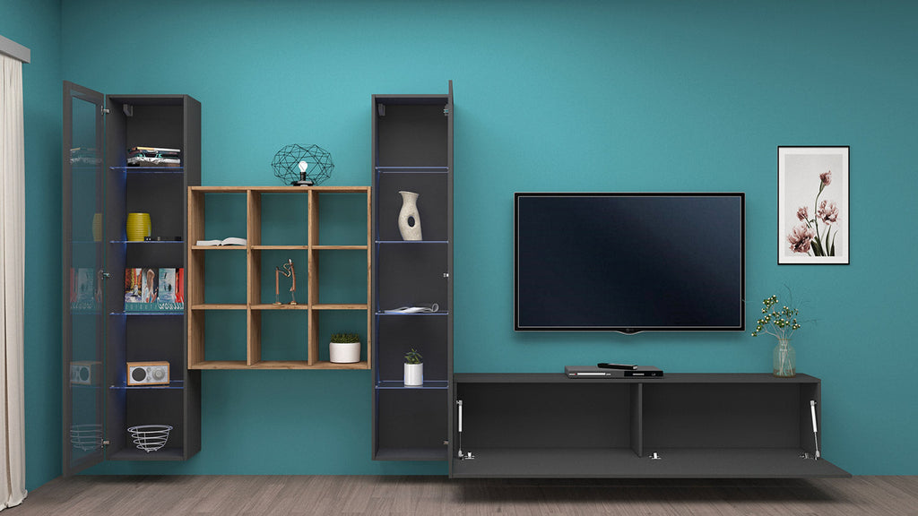Il soggiorno MARUSKA n°27 da 350 cm è caratterizzato da una parete con 2 vetrine, 1 mobile porta tv e una libreria 9 vani. La parete del soggiorno può essere montata sia a terra che appesa. Le vetrine hanno 1 anta telaio con vetro e al suo interno 4 ripiani, realizzati anch’essi in vetro. Il mobile porta tv è dotato di 1 anta a ribalta, regolata da dei braccetti a gas: può essere montato a destra o a sinistra. Il soggiorno è interamente realizzato in melaminico bianco laccato lucido o antracite opaco, la libreria invece, è il legno rovere wotan, certificato FSC. Il soggiorno MARUSKA n° 27, con le sue forme moderne si adatta a qual sia si tipologia di arredamento. All’interno della confezione si trovano un kit di montaggio e delle istruzioni, facili da seguire anche per i non esperti.