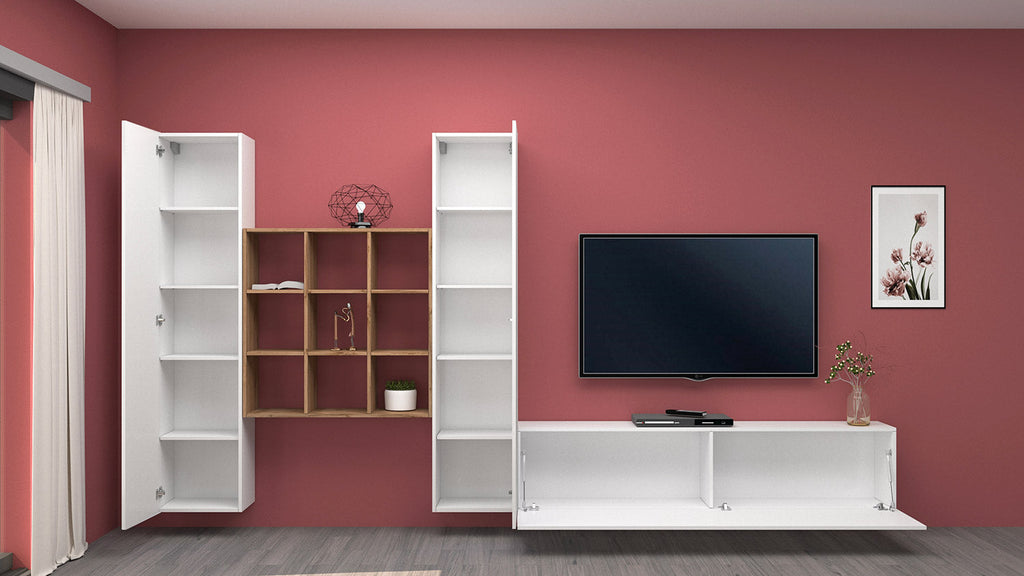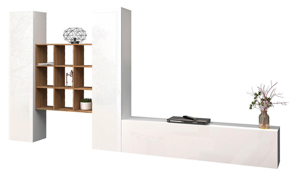 Il soggiorno MARUSKA n°30 da 350 cm è caratterizzato da una parete con 2 colonne armadio, 1 porta tv, e una libreria 9 vani. La parete del soggiorno può essere montata sia a terra che appesa. Le colonne armadio hanno 1 anta battente e all'interno sono dotate di 4 ripiani in legno. Il mobile porta tv è dotato di 1 anta ribalta, regolata da dei braccetti a gas. Può essere montato a destra o a sinistra. Il soggiorno comples sivamente è realizzato in melaminico bianco laccato lucido o antracite opaco, anche se la libreria è in rovere wotan. Il soggiorno MARUSKA n° 30 si adatta a ogni tipo di arredamento, provvisto di un design innovativo. All’interno della confezione si trovano: un kit di montaggio e delle istruzioni semplici e dettagliate.
