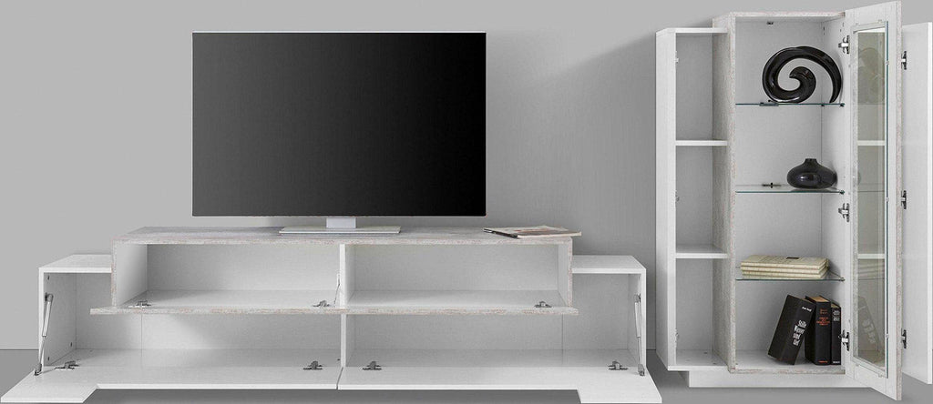 Parete Attrezzata Soggiorno Porta TV 200x45x51,6 cm con Vetrina Coro Bianco Lucido e Cemento