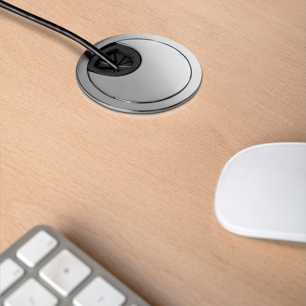 Couvercle de gestion des câbles encastré pour n'importe quel bureau ou table, en zamak . Masque les connexions facilement accessibles en tirant simplement le couvercle avec une simple torsion.