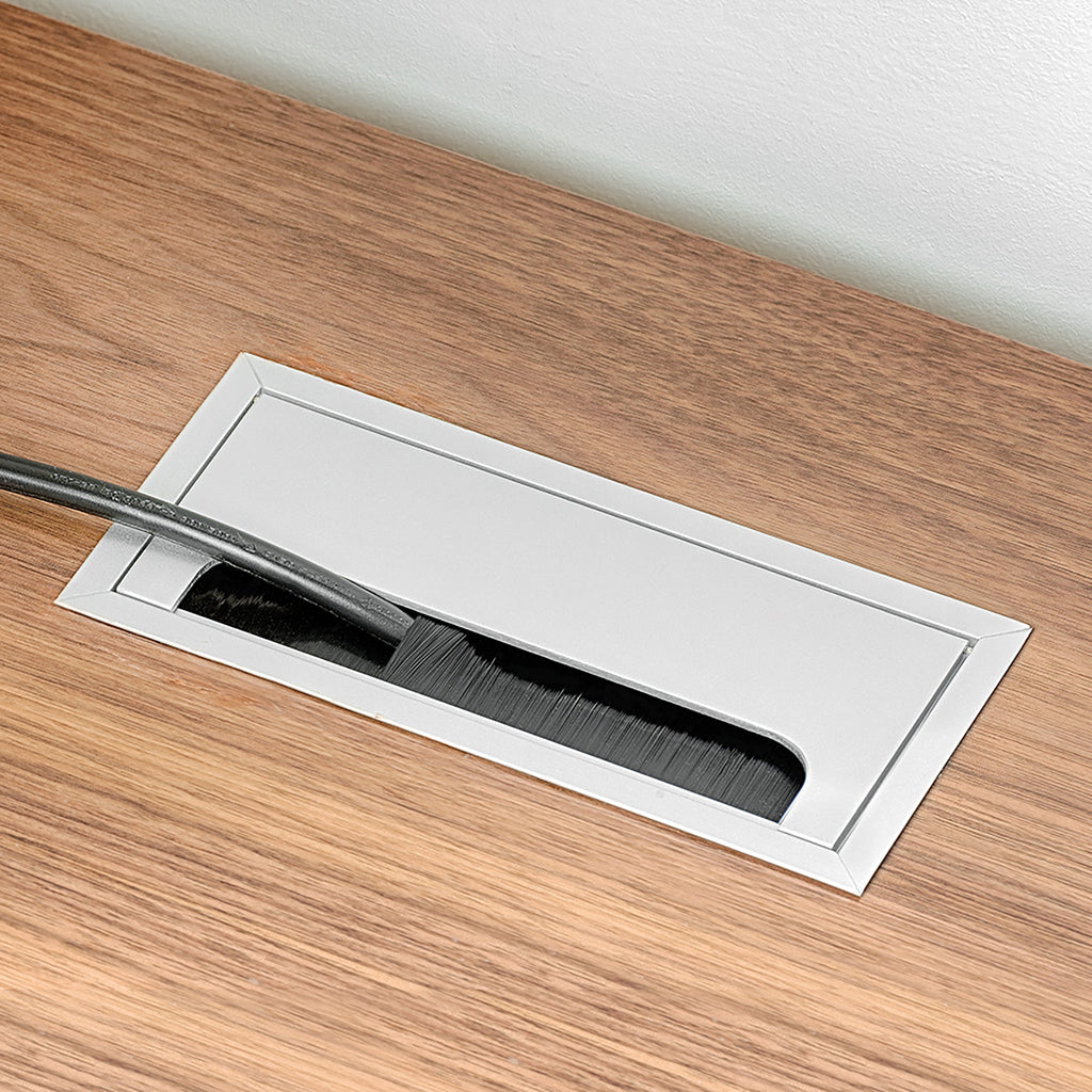Passe-câbles rectangulaire à intégrer dans n'importe quel bureau ou table, en aluminium anodisé mat . Sa forme rectangulaire permet de faire passer des câbles de différentes tailles et épaisseurs et de les dissimuler facilement grâce à son couvercle rabattable .