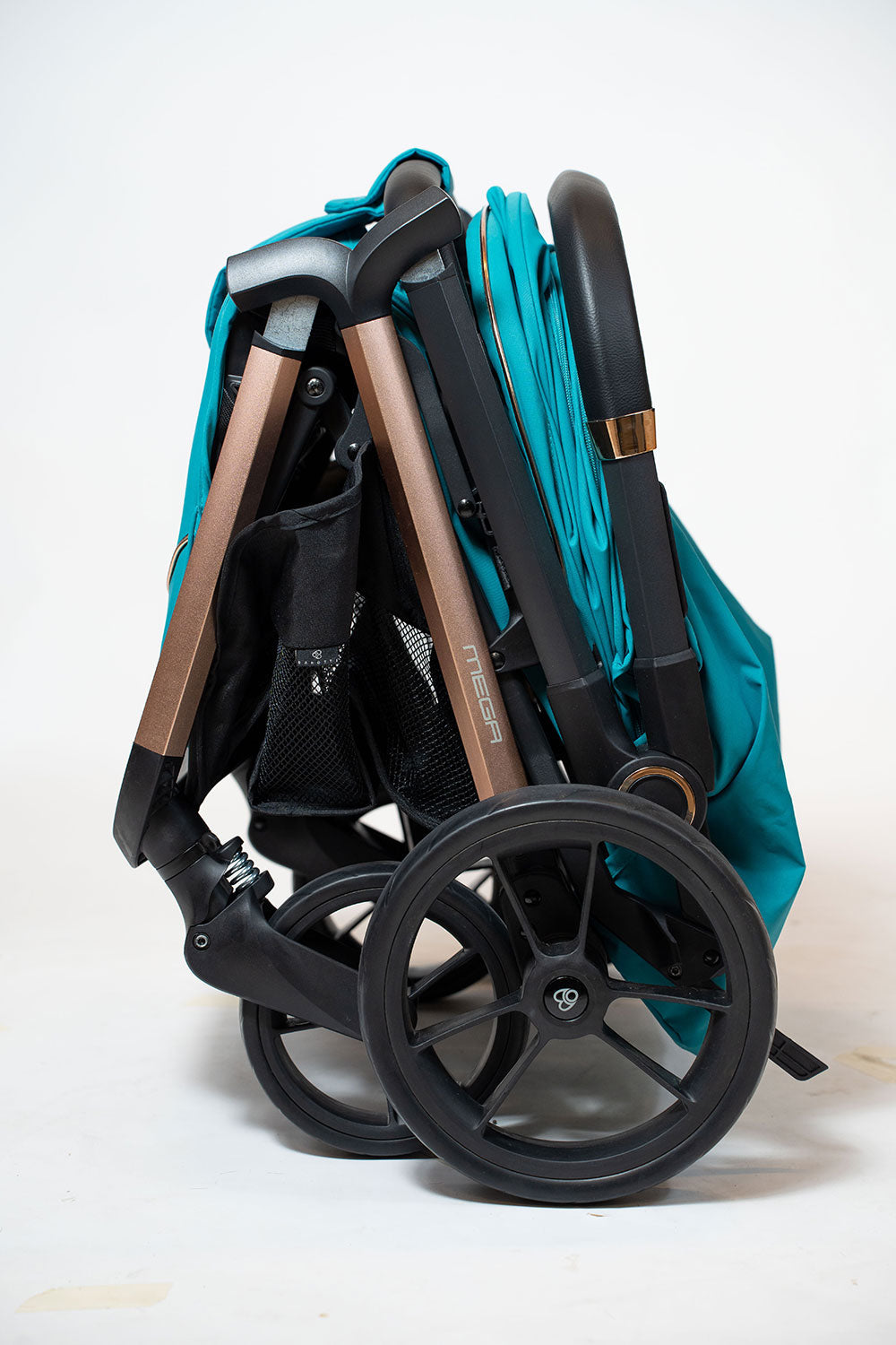 Mega è realizzato con finiture di pregio, maniglilone in eco-pelle, seduta ampia e comoda, davantino in eco-pelle facilmente removibile, ruote grandi ideali su ogni terreno, con i cuscinetti a sfera in metallo, in poliuretano per garantire la massima tenuta (grip) ed una maggiore durevolezza, sospensioni anteriori e posteriori, cinghia a 5 punti con spallacci imbottiti, ampio cestino e borsa abbinata.