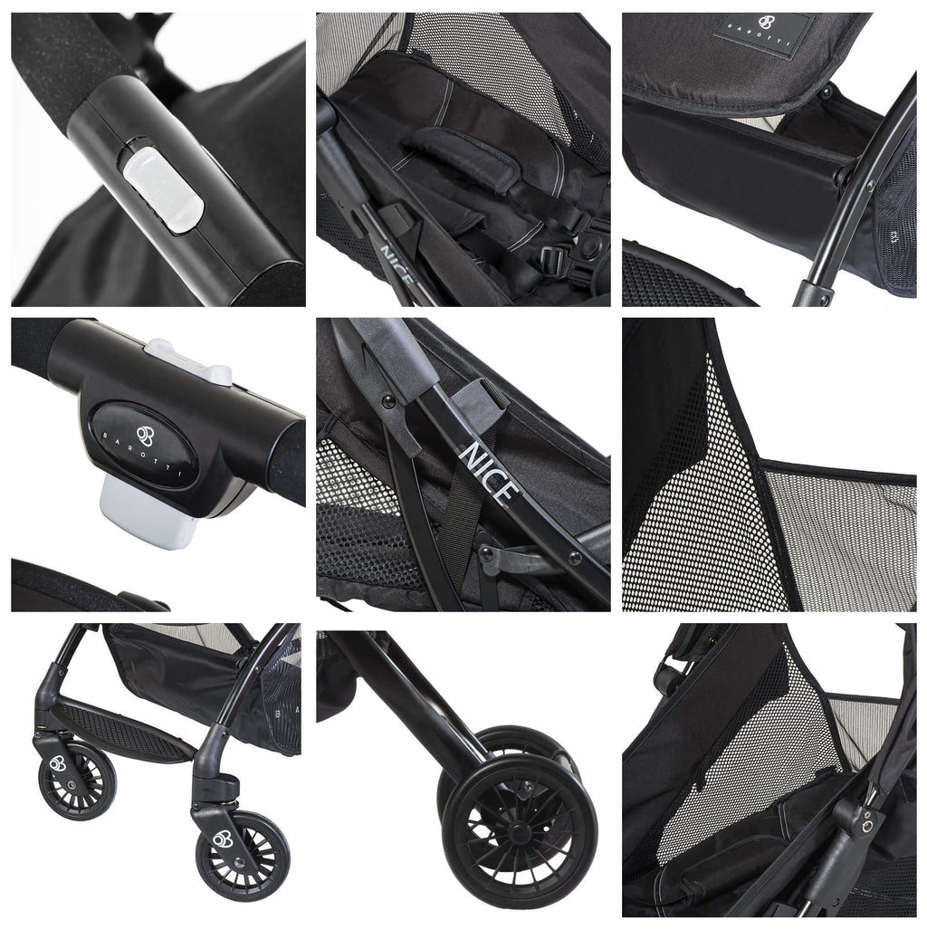 Nice est la nouvelle poussette ultra légère de Barotti, au design innovant et tendance, totalement respirante, particulièrement utile pendant les heures les plus chaudes de la journée, le tissu est entièrement amovible et lavable, une fois fermé, il se transforme en une poussette pratique et facile à nettoyer. -Chariot à poignée, compatible avec les dimensions du bagage à main dans l'avion.