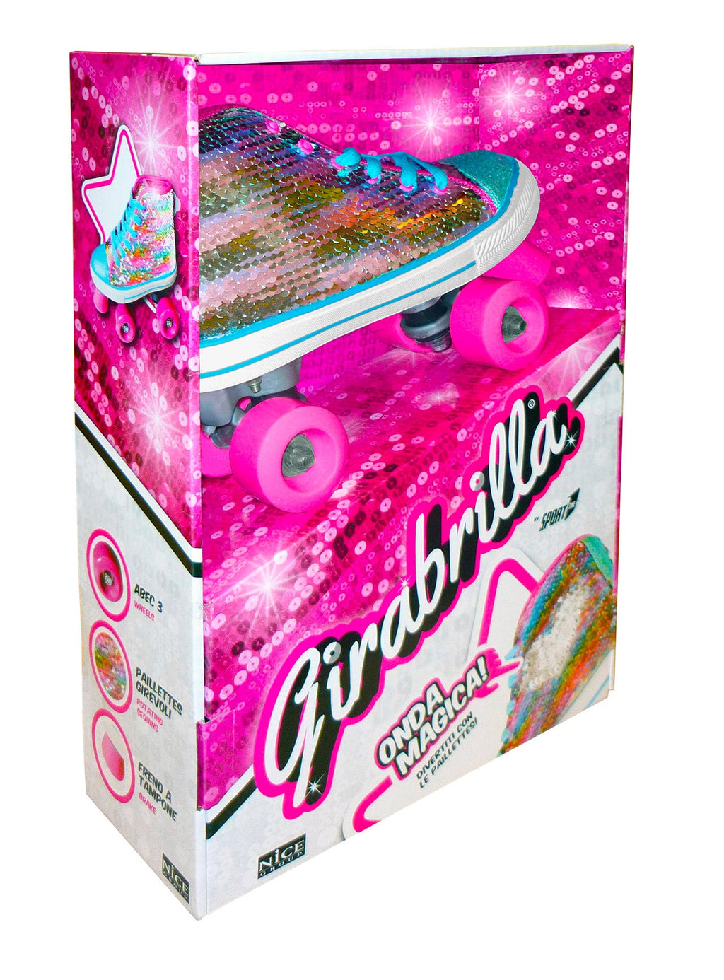 Pattini con gruppo ruote classiche 2 ruote anteriori e 2 ruote posteriori (QUAD). Realizzati con una calzata stilosa che ricorda le sneaker, presentano paillettes iridescenti girevoli per un tocco di glamour. Dotati di freno a tampone per una facile frenata. Le ruote da 50x30mm e i cuscinetti di precisione garantiscono una scorrevolezza fluida. Con una portata massima di 60 kg, sono perfetti per chi cerca un modo divertente e alla moda per muoversi.