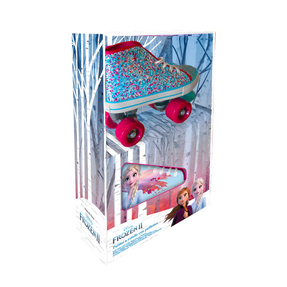 I pattini con groupo ruote classiche sono caratterizzati da due ruote anteriori e due posteriori, seguendo il design QUAD. La calzata è simile a quella di una sneaker e presenta una stampa ufficiale FROZEN sul lato interno, mentre sul lato esterno sono presenti paillettes colorate girevoli. I pattini sono dotati di un freno a tampone per garantire la sicurezza durante l'uso. Le ruote hanno dimensioni di 50x30mm e i cuscinetti di precisione assicurano una scorrevolezza fluida. La portata massima è di 60 kg.