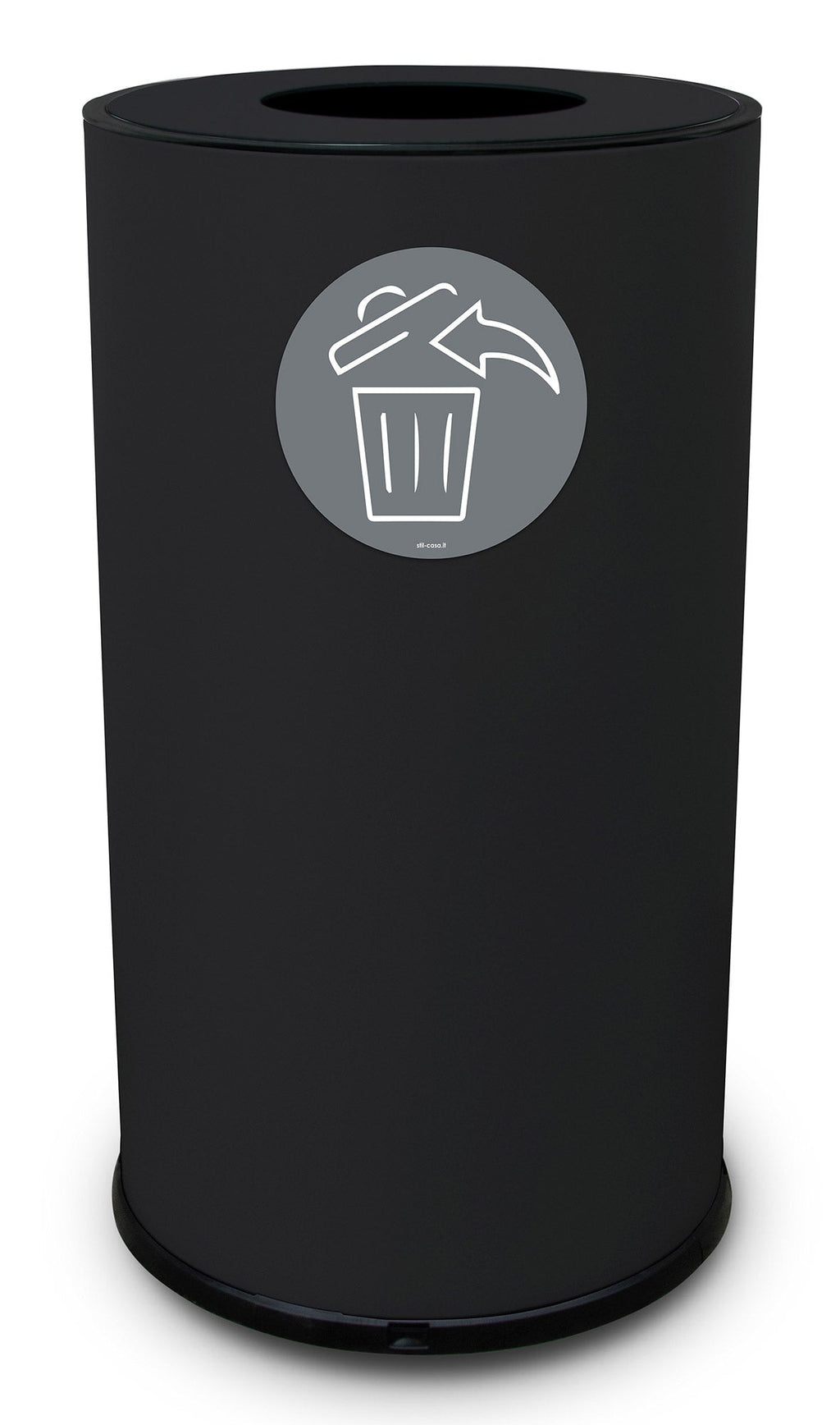 Elegante e funzionale contenitore per raccolta rifiuti, cover a uno scomparto, realizzato totalmente in acciaio verniciato nero con vernici termoindurenti. Inserimento sacchetto tramite pratico reggisacco interno con svuotamento dall'alto. Pittogramma magnetico con simbolo "indifferenziato" incluso, facile da apporre e rimuovere per permettere una corretta pulizia del prodotto. Fondo in metallo con bordino salva pavimento