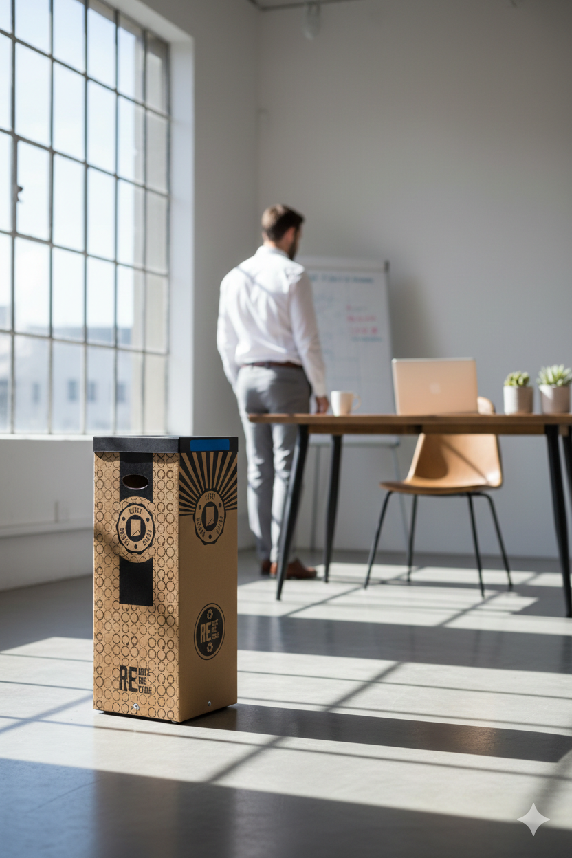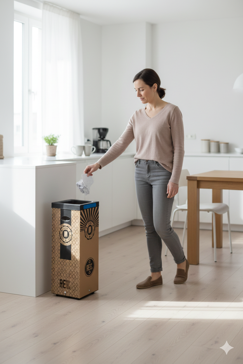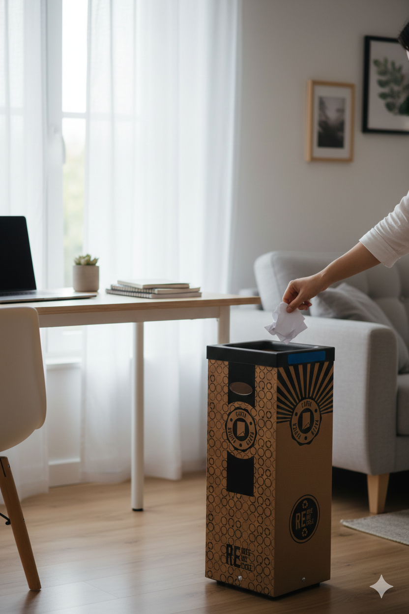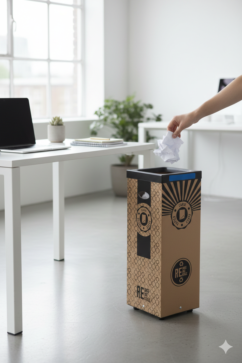 Contenitore per raccolta rifiuti realizzato in cartone 70% riciclato, spessore 7 mm. Stampa digitale realizzata direttamente sul materiale, grafica "carta". Cover superiore in plastica nera 100% riciclata. Kit quattro adesivi colorati incluso per differenziare la raccolta. Fondo in metallo verniciato nero. Piedi in gomma antigraffio. Articolo venduto smontato, dotato di istruzioni