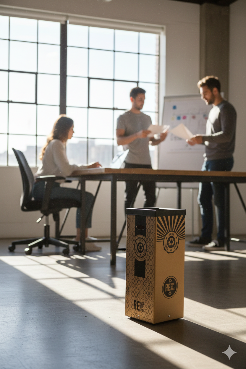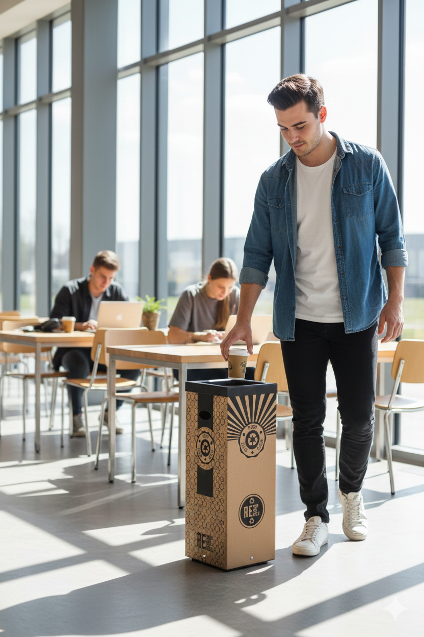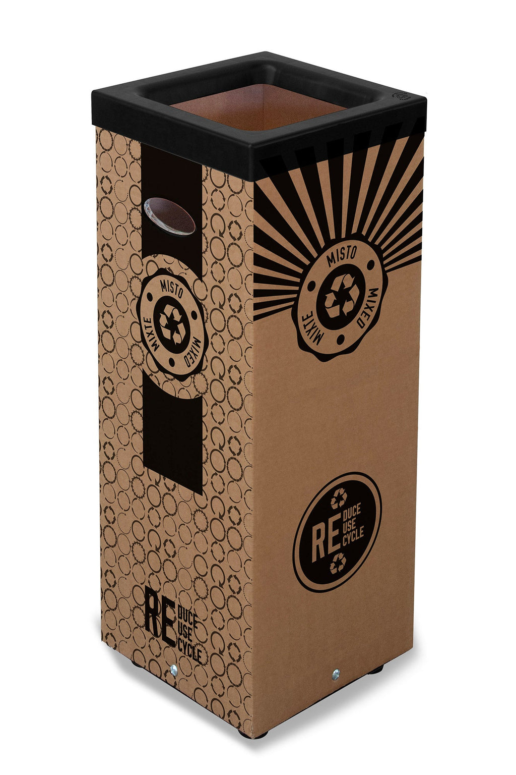 Contenitore per raccolta rifiuti realizzato in cartone 70% riciclato, spessore 7 mm. Stampa digitale realizzata direttamente sul materiale, grafica "misto". Cover superiore in plastica nera 100% riciclata. Kit quattro adesivi colorati incluso per differenziare la raccolta. Fondo in metallo verniciato nero. Piedi in gomma antigraffio. Articolo venduto smontato, dotato di istruzioni