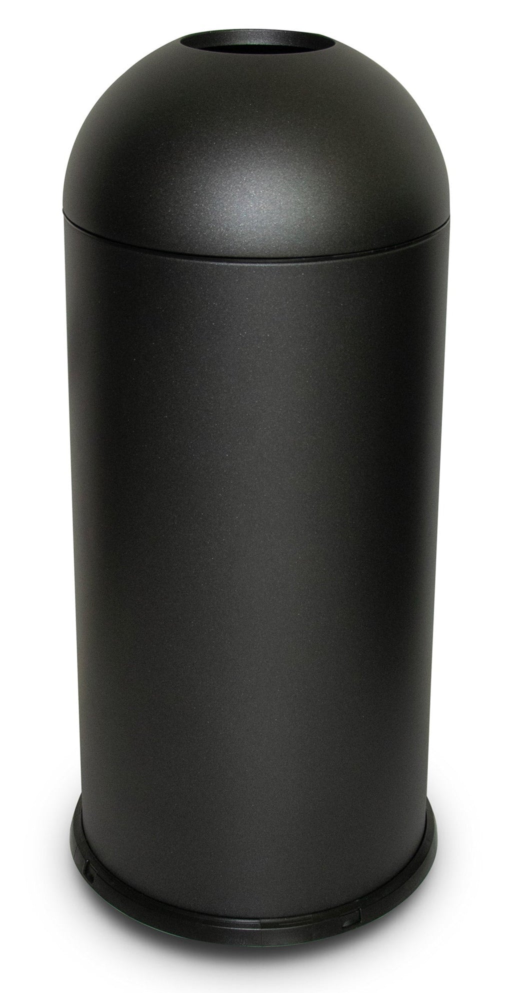 Elegante e funzionale sistema di raccolta rifiuti da interno realizzato totalmente in acciaio verniciato nero. Capacità 68 litri. Inserimento sacchetto tramite pratico reggisacco interno con svuotamento dall'alto. Testa superiore semi-sferica con foro getta rifiuti Ø 14 cm. Ideale per gettare bicchieri. Fondo in metallo con bordino salva pavimento