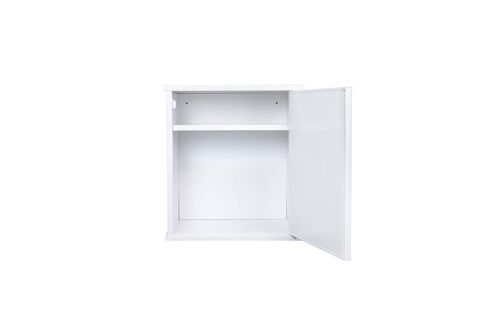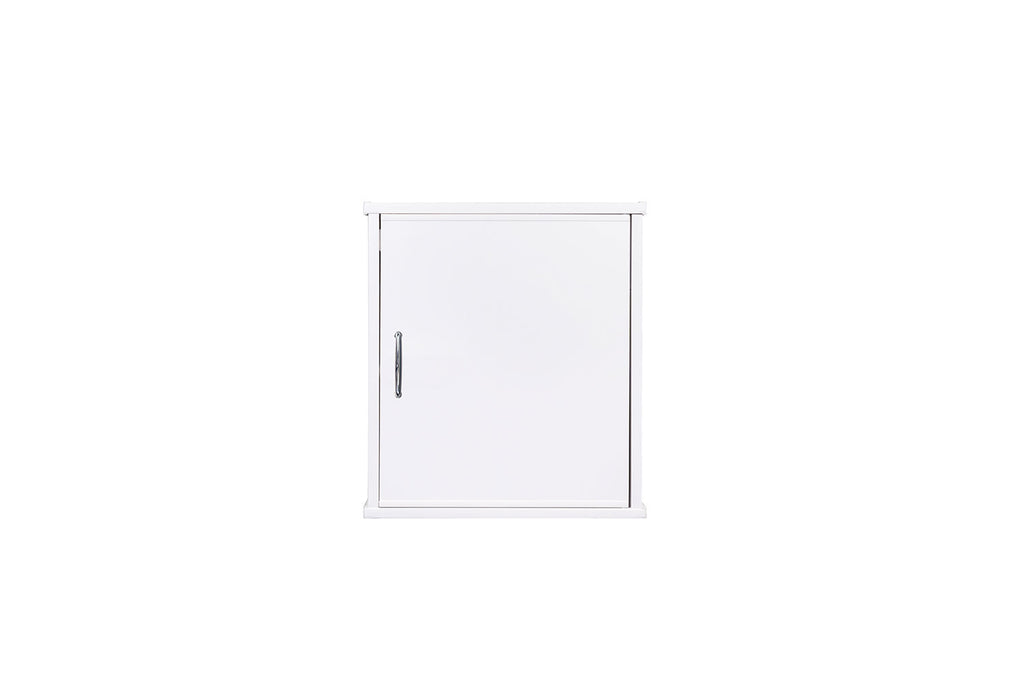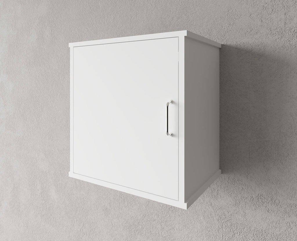 Mobile con ripiano interno, realizzato in PVC resistente all’acqua, pensile per composizione lavanderia, sportello pieno con chiusura a battente e maniglia cromata.