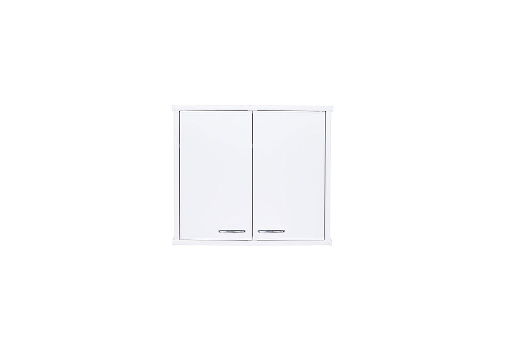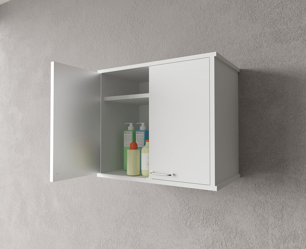 Mobile con ripiano interno, realizzato in PVC resistente all’acqua, pensile per composizione lavanderia, sportello pieno con chiusura a battente e maniglia cromata.