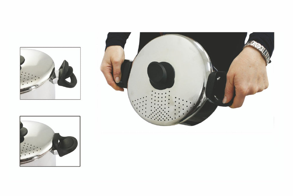 Le système autobloquant maintiendra le couvercle à la casserole, le matériau calorifuge des poignées permettra des mouvements faciles sans crainte de se brûler.
