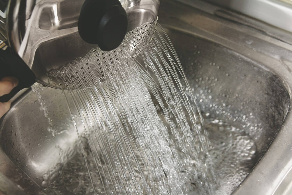 Inclinez simplement la casserole dans l'évier et l'eau sera expulsée des trous.