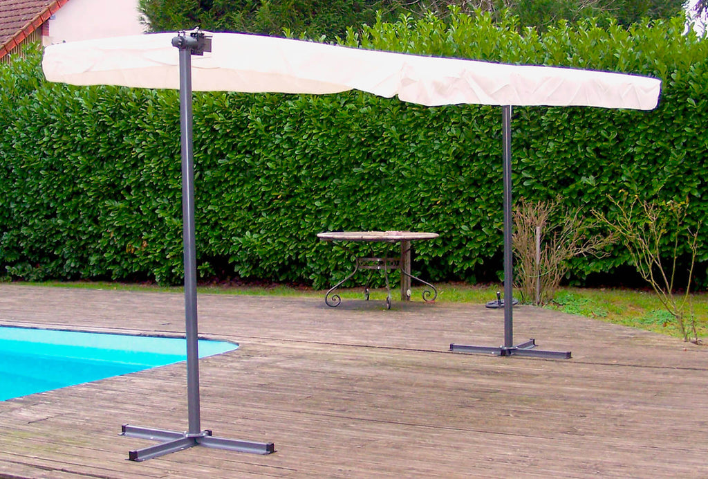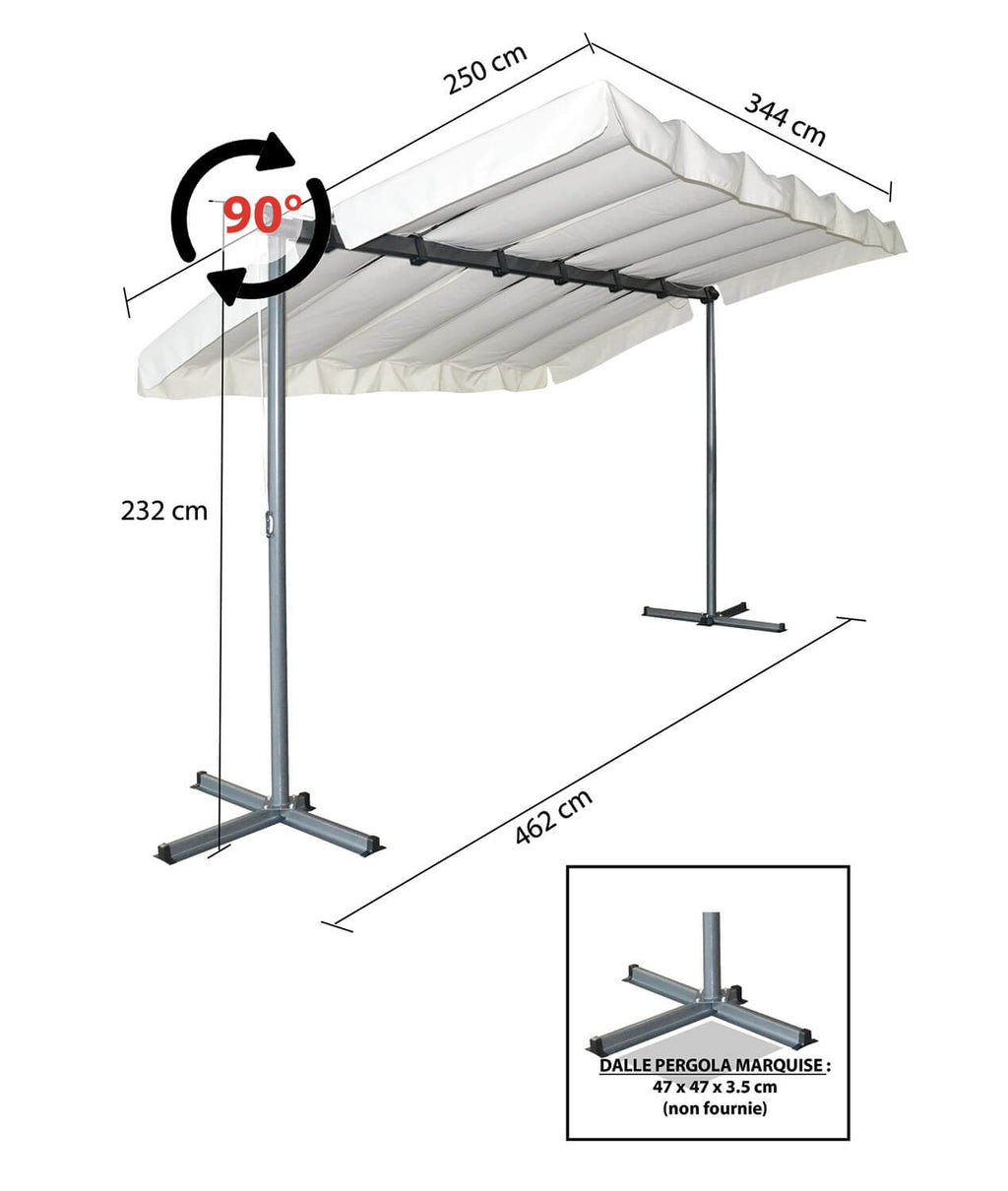 Pivotant sur un axe de 90°, et offrant la possibilité de régler son ouverture via son système coulissant, il se plie à souhait en quelques secondes pour jouer avec le soleil et l'ombre selon votre humeur. Elégante et au design contemporain, elle s'intègre parfaitement sur une terrasse, près d'une piscine ou autour d'un jardin. Simple à mettre en place, il dispose de pieds croisés pouvant accueillir des plaques de contrepoids (non fournies), garantissant sa stabilité dans les zones de vent fort.