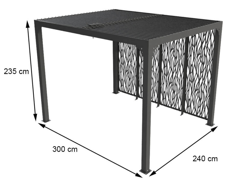 Cette pergola vous permet de couvrir un espace de 7,20 m2 pour sa dimension de 2,4x3 m composée de 52 lattes, inclinable à 90° par son mécanisme d'ouverture et de fermeture à manivelle, vous avez un large choix de soleil ou d'ombre selon vos envies. Avec sa structure en aluminium il dispose de pièces de jonction en acier thermolaqué pour assurer un maintien optimal en toutes circonstances. Autoportante, facile à monter, permettant d'alterner soleil ou ombre pendant les saisons chaudes et de se protéger des aléas climatiques le reste de l'année, elle est également équipée de 4 panneaux moucharabiehs. Installés du côté de 3 mètres de la pergola bioclimatique, ses 4 panneaux, véritables écrans en acier thermolaqué, offrent un coin d'ombrage qui atténue les effets du soleil vivifiant, et se transformerait, à travers les élégantes spirales perforées qui le composent, en insistant vents en ventilation légère. Autonome, fixé sur un cadre vissé au sol, fabriqué à partir d'un acier très résistant de 1 mm, chaque panneau et poteau est thermolaqué, offrant une protection visuelle tout en résistant au vent et autres impacts. Sa notice de montage complète et détaillée confirmera votre choix et facilitera l'installation de cette pergola.