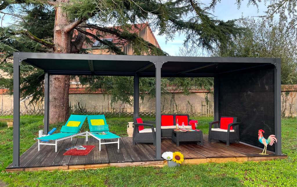 La pergola bioclimatique offre aux personnes un espace de détente optimisé, pour se protéger du soleil d'été, offrant la possibilité de laisser entrer la lumière et la chaleur pendant les mois d'hiver. Pour optimiser votre confort, il est équipé d'un rideau latéral pour un des côtés de 3,60 m.
