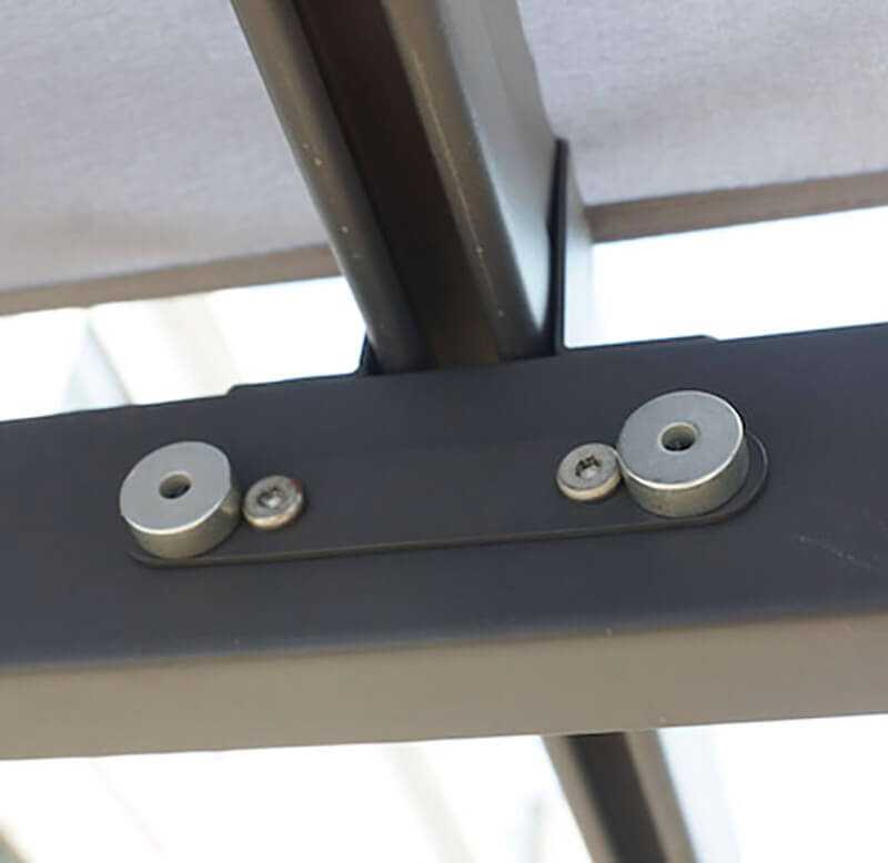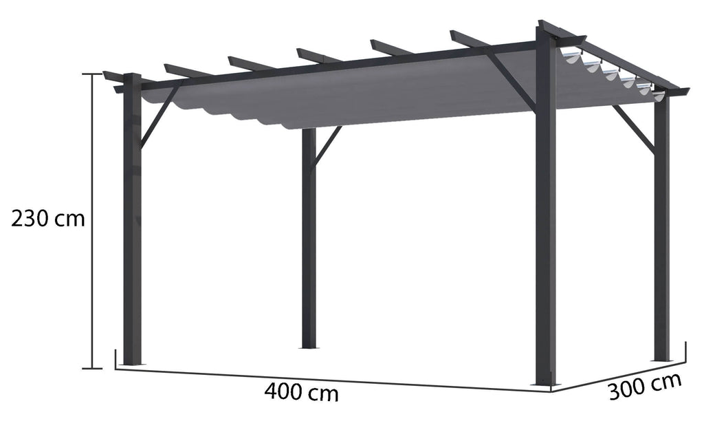 - Livré avec : 4 poteaux de 10 x 10 cm d'épaisseur 1,2 mm, plaques de fixation au sol 16 x 16 cm d'épaisseur 3 mm, poignées d'ouverture et de fermeture de la toile, bande de protection avant et arrière