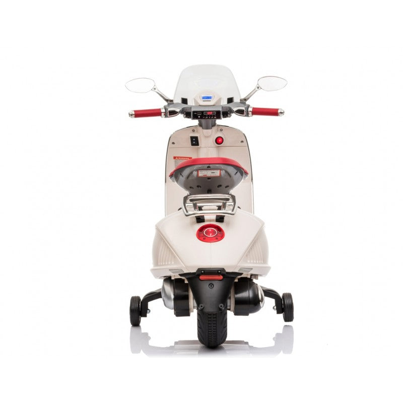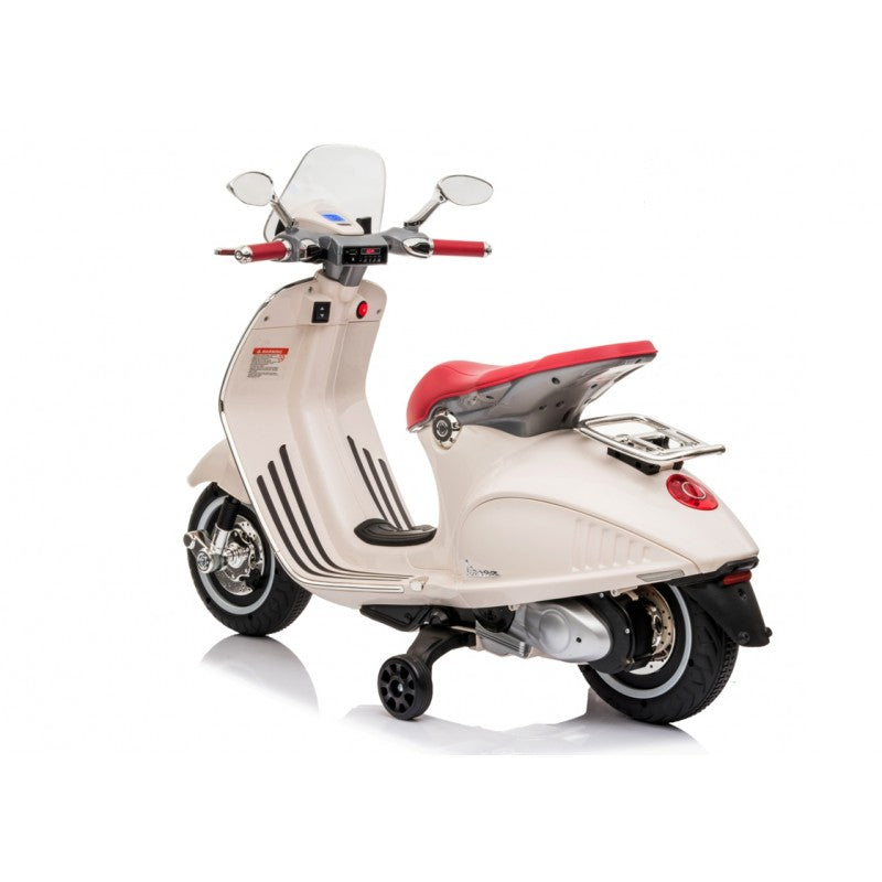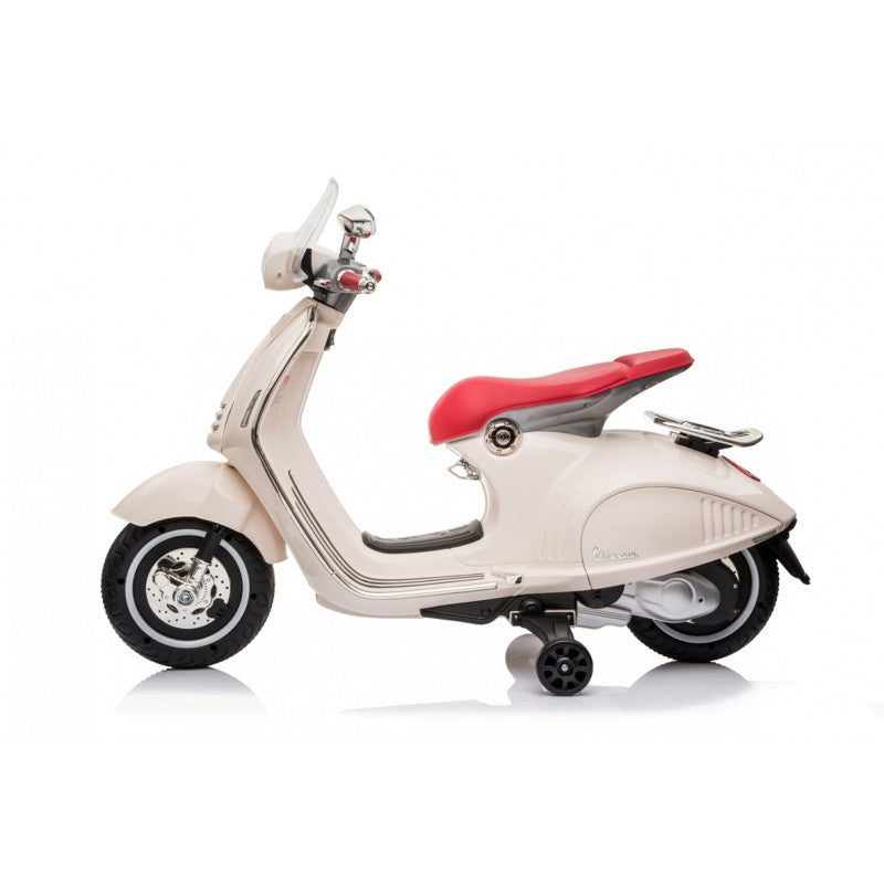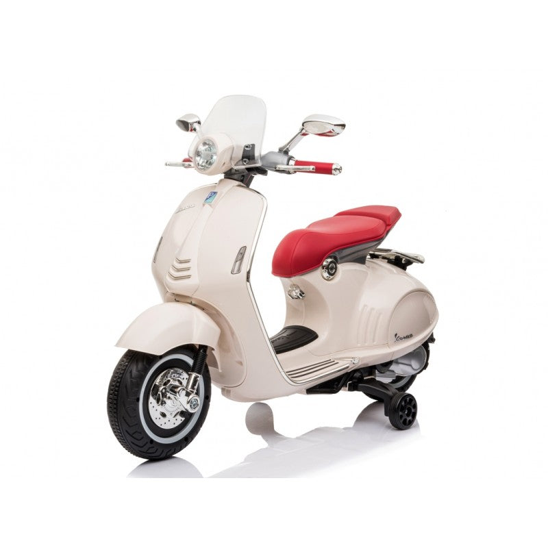 Belle moto électrique Piaggio Vespa 946 pour les enfants de 3 à 6 ans également adaptée aux plus petits (sous surveillance parentale étroite). Unique dans son style avec deux directions : avant-arrière, pédale d'accélérateur, phare avant qui s'illumine avec des lumières LED, des sons réalistes et diverses musiques intégrées. Excellentes finitions chromées, siège en similicuir. Batterie et chargeur 12V inclus.