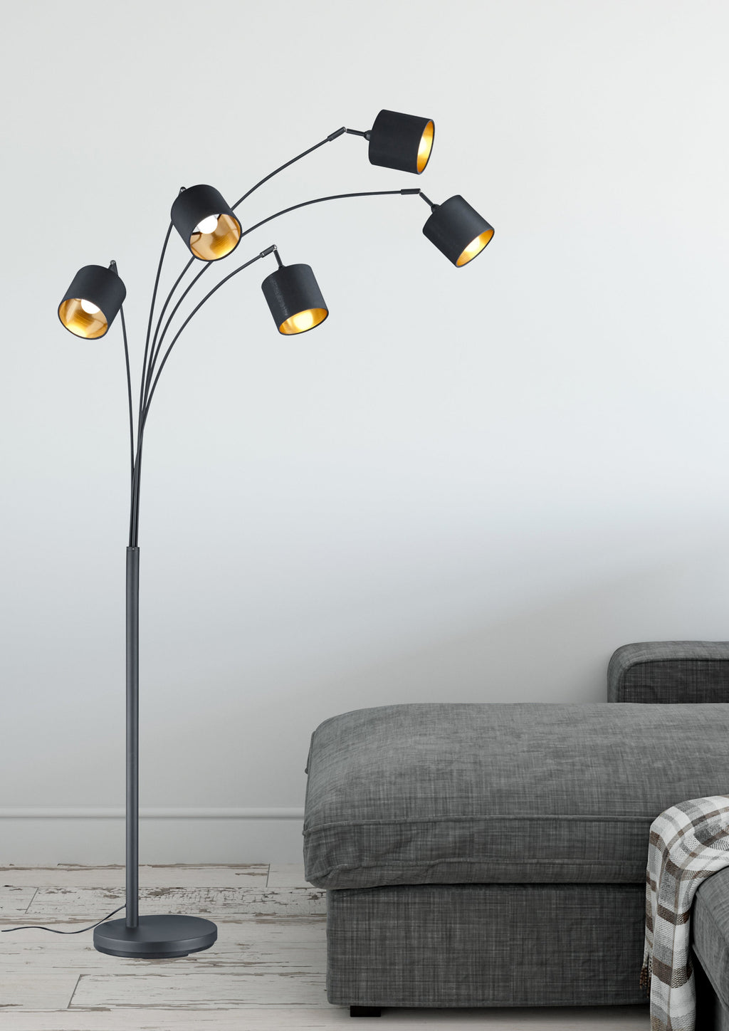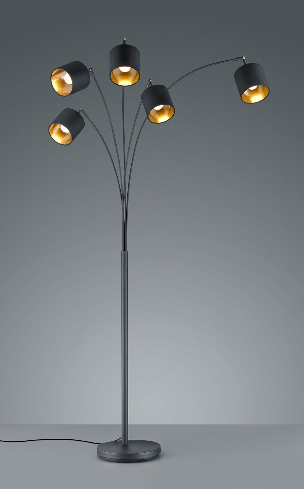 Tommy Lampadaire Arqué Avec 5 Diffuseurs Abat-jour Noir Et Doré Socle Métal Noir Mat H.200Cm