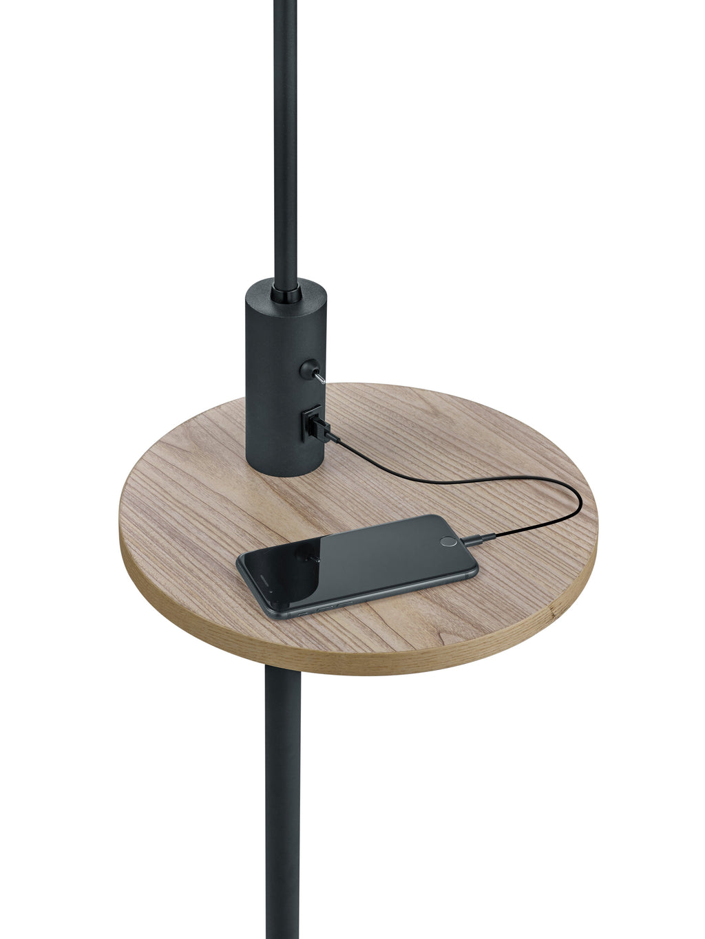 Lampadaire Claas Noir Avec Articulation, Étagère Et Connexion Usb Pour Recharge Smarthpone Et Tablette H. 160Cm