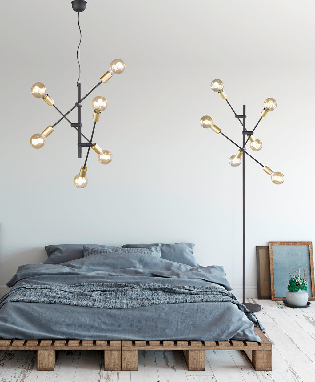Lampadaire Cross 3 Bras Réglables 6 Lumières Noir Mat Et Doré H. 165Cm