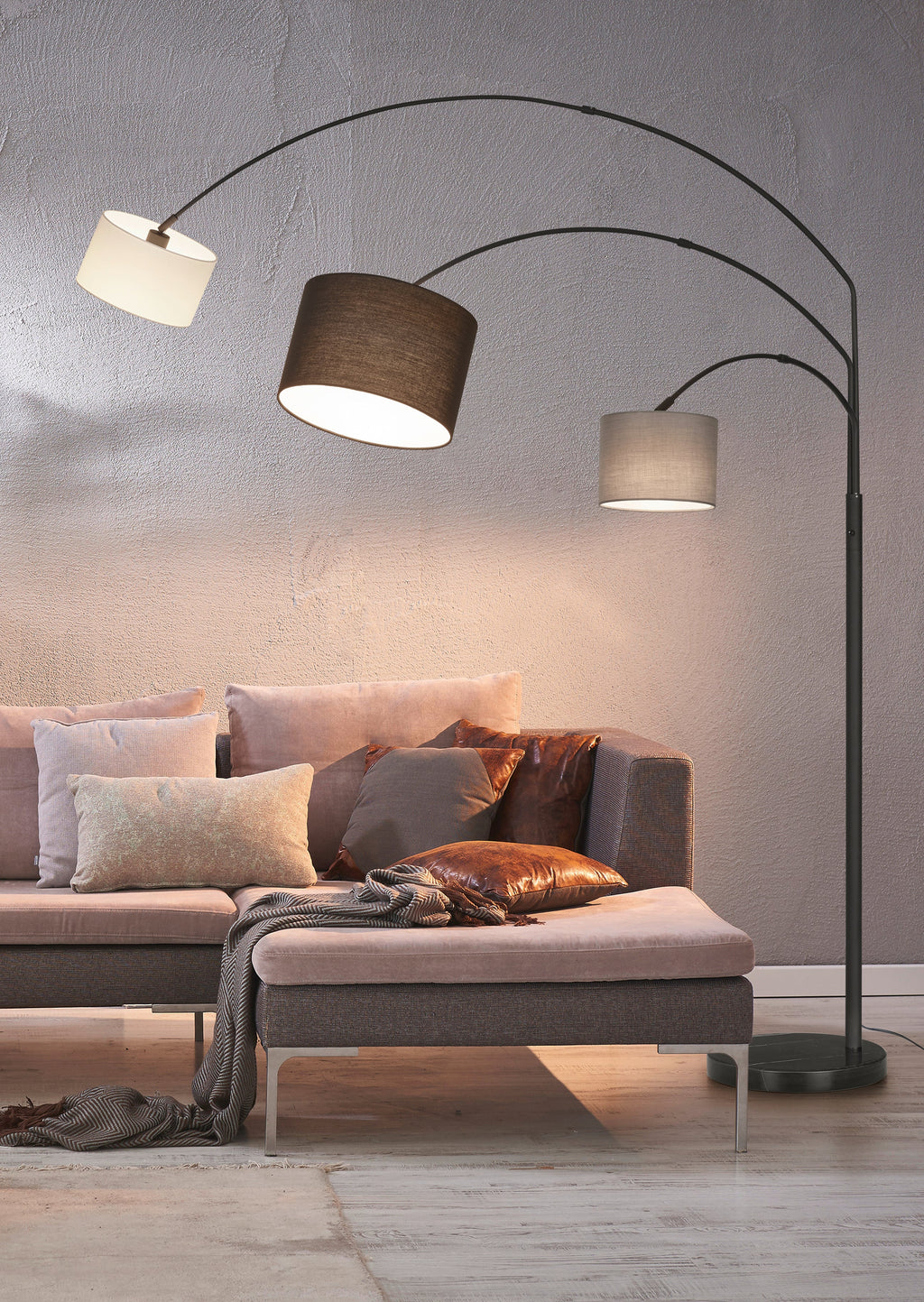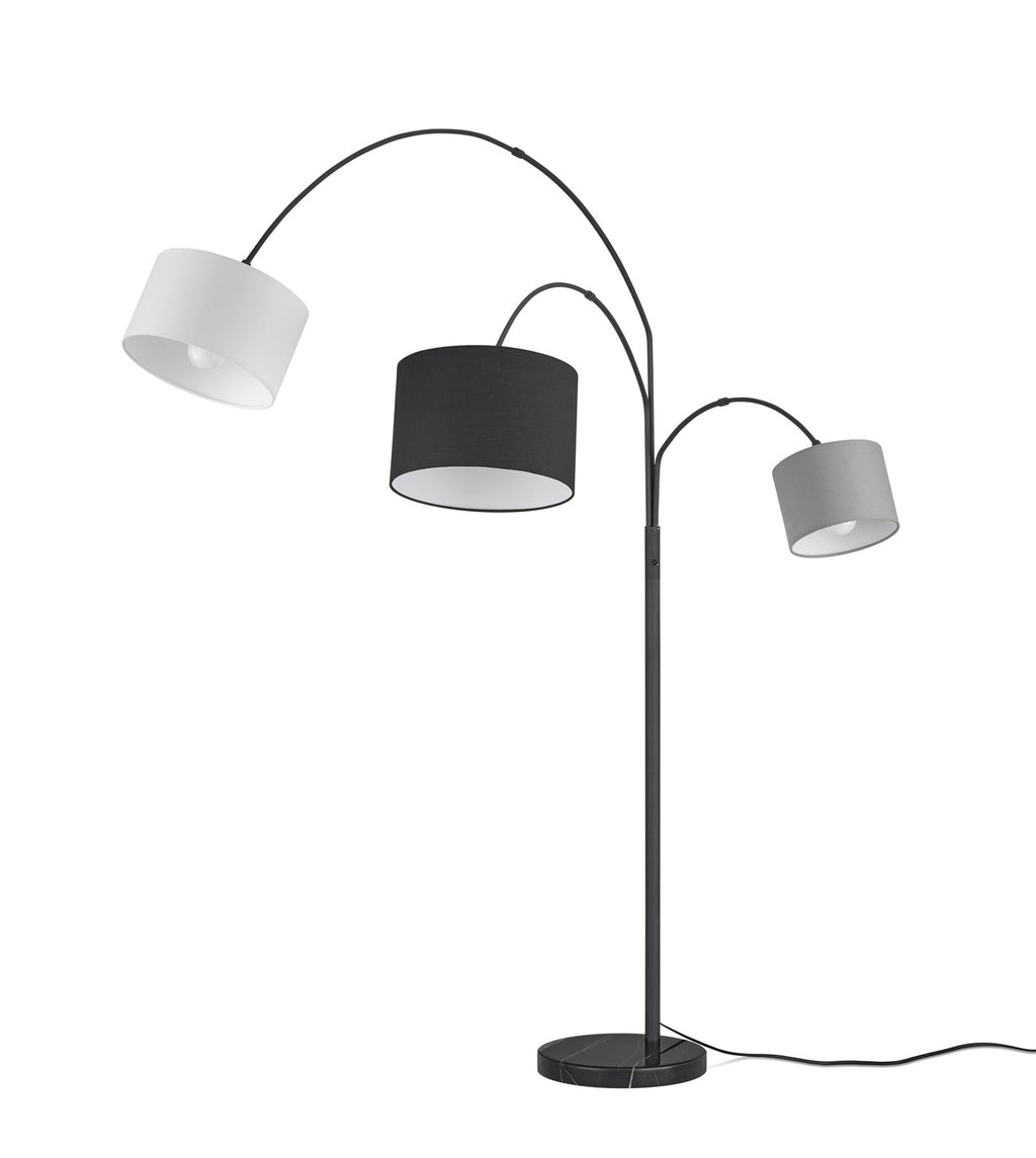 Lampadaire Arqué Clark Noir Mat Avec 3 Abat-jour Différents Diamètres Et Couleurs H. 194Cm