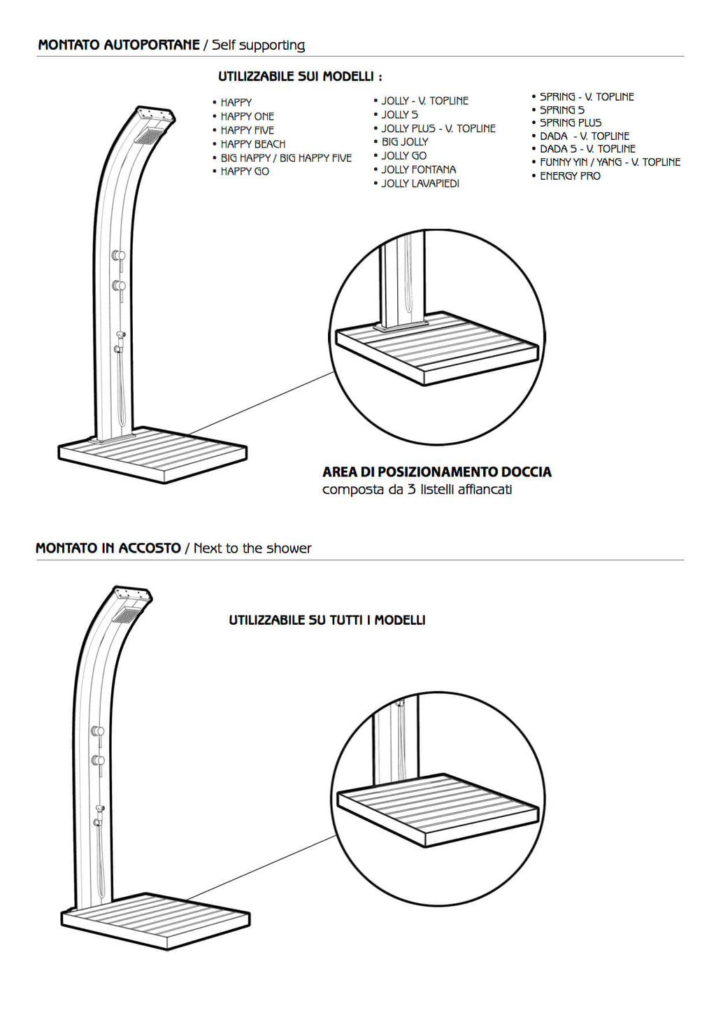 Il Piatto Doccia in Legno di Arkema può essere montato sia Autoportante (con la Doccia montata sopra), grazie all'area di posizionamento della doccia, composta da 3 listelli affiancati o in Accosto (con la Doccia Montata accanto).