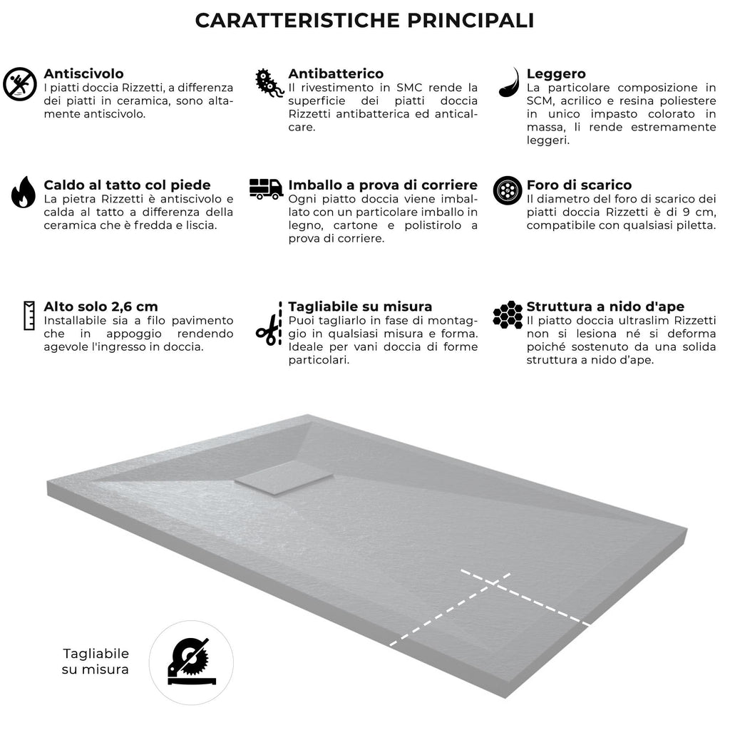 Les receveurs de douche Rizzetti Ardesia Muse sont très résistants aux rayures, grâce à la protection apportée par la solidité des matériaux utilisés, ils assurent une résistance maximale aux rayures, aux rayons UV et sont étanches, offrant une sensation de chaleur au toucher avec le pied .