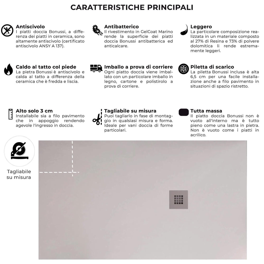 Les receveurs de douche en ardoise Everest Bonussi sont très résistants aux rayures, grâce à la protection de 1 mm d'épaisseur en Gelcot Sanitaire Marin Antibactérien qui est le même matériau utilisé pour recouvrir les coques des bateaux mais encore durci, assurant une résistance maximale aux rayures, aux rayons UV et sont imperméables, offrant une sensation de chaleur au toucher du pied .