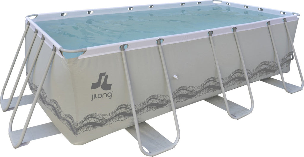 Piscine hors sol rectangulaire grise Jilong avec structure en acier antirouille et revêtement en PVC multicouche.