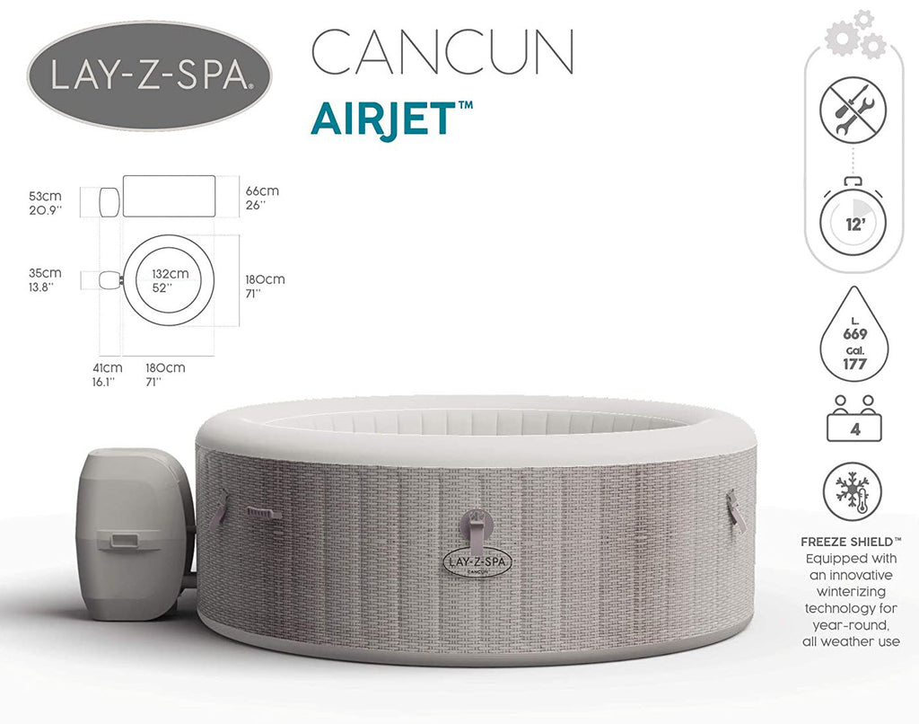 Piscine d'hydromassage Lay-Z Spa Bestway Cancun Airjet . Votre idée de la relaxation est sur le point de changer pour toujours, grâce à Lay-Z-Spa, l'hydromassage extérieur que vous préparez en quelques minutes seulement et qui ne prend pas de place lorsque vous ne l'utilisez pas. Parfait si vous souhaitez découvrir le luxe d'un véritable spa chez vous, disposez de peu d'espace et souhaitez économiser de l'argent. Nous assemblons tous nos spas un à un, les laissons gonflés pendant 24 heures et enfin les démontons pour assurer le parfait fonctionnement de tous les composants.