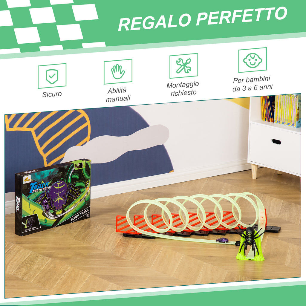 - LIGHT TRACK : Jouez dans le noir pour voir les voitures courir avec des effets de lumière ! Avec son ouverture comportant une grande araignée, cette piste de voiture crée un effet mystérieux et amusant. La voiture jouet a une lumière, que vous pouvez activer à l'aide du bouton en bas (les piles sont nécessaires, non incluses).