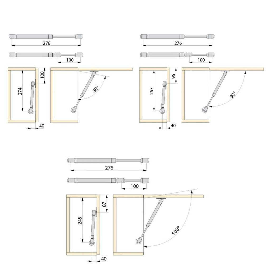 Piston à Gaz Pour Portes Abattantes Force 11 Kg Course 100 mm Gris Métallique 10 Pièces Emuca