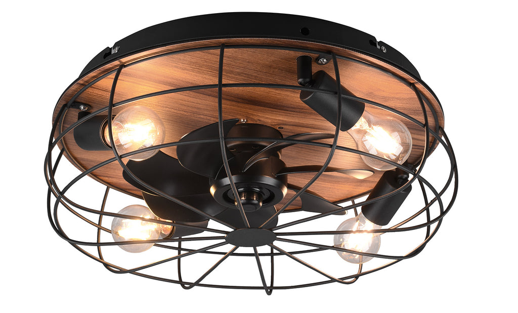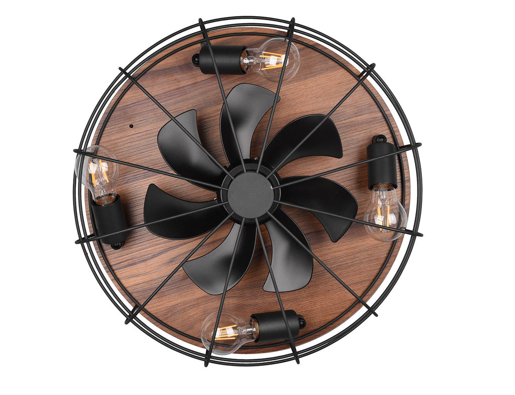 Trondheim Plafoniera con Ventilatore Gabbia Metallo Nero Opaco e Base Effetto Legno con Telecomando Multifunzione Regolazione 3 Intensità e Timer D.50Cm
