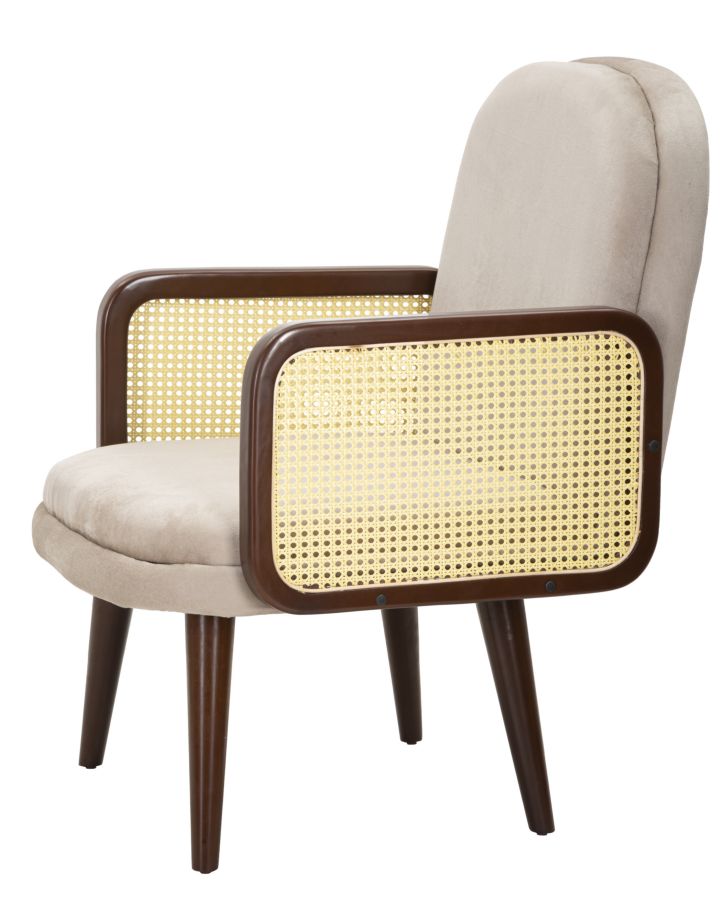Fauteuil élégant en tissu rembourré avec accoudoirs particuliers en bois et paille de Vienne au design inspiré des années 70.