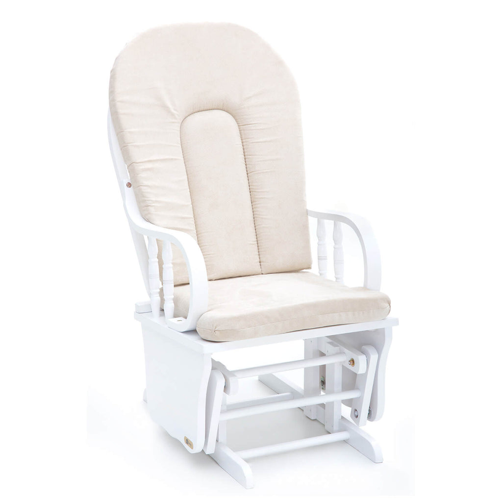 Fauteuil à bascule oscillant avec structure en bois massif peint en blanc, coussin en dalle rembourrée en polyester beige.