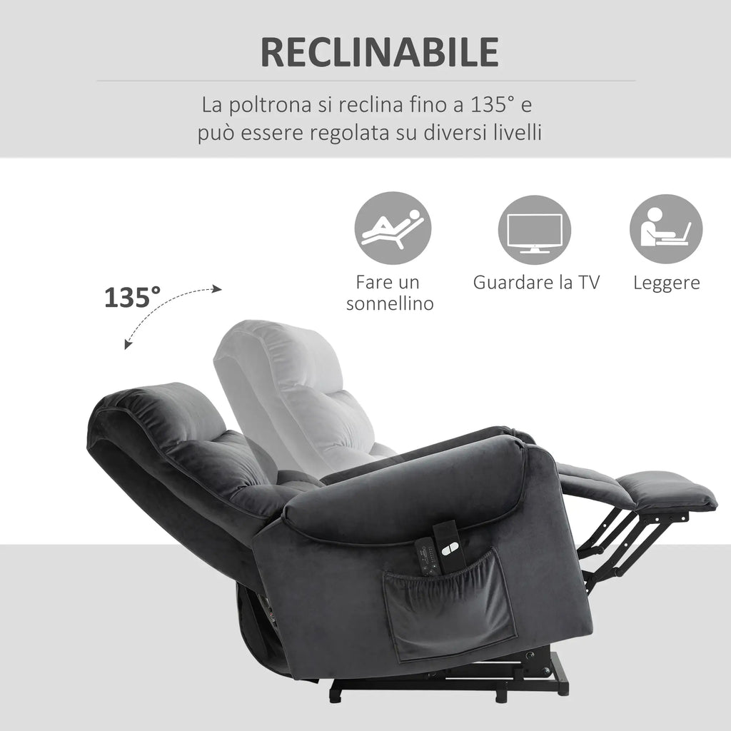 Fauteuil Élévateur Électrique 1 Moteur 79x97x103 cm en Polyester Effet Velours Gris Foncé