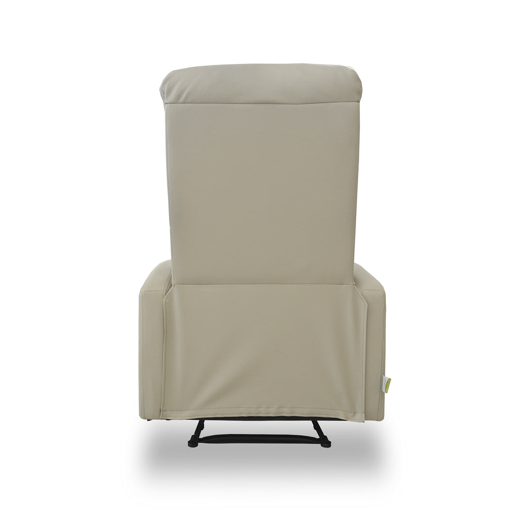 Fauteuil inclinable avec fonction relevable. Le mécanisme d'inclinaison du dossier avec relèvement simultané du pied de lit est électrique et est géré par une télécommande qui peut être rangée dans la pochette appropriée située sur le côté extérieur de l'accoudoir droit. Toute la structure du fauteuil, en bois et métal tubulaire, est rembourrée en feuilles de polyuréthane. L'assise et le dossier sont rembourrés de polyuréthane haute densité. Le revêtement de l'ensemble du fauteuil est en simili cuir.