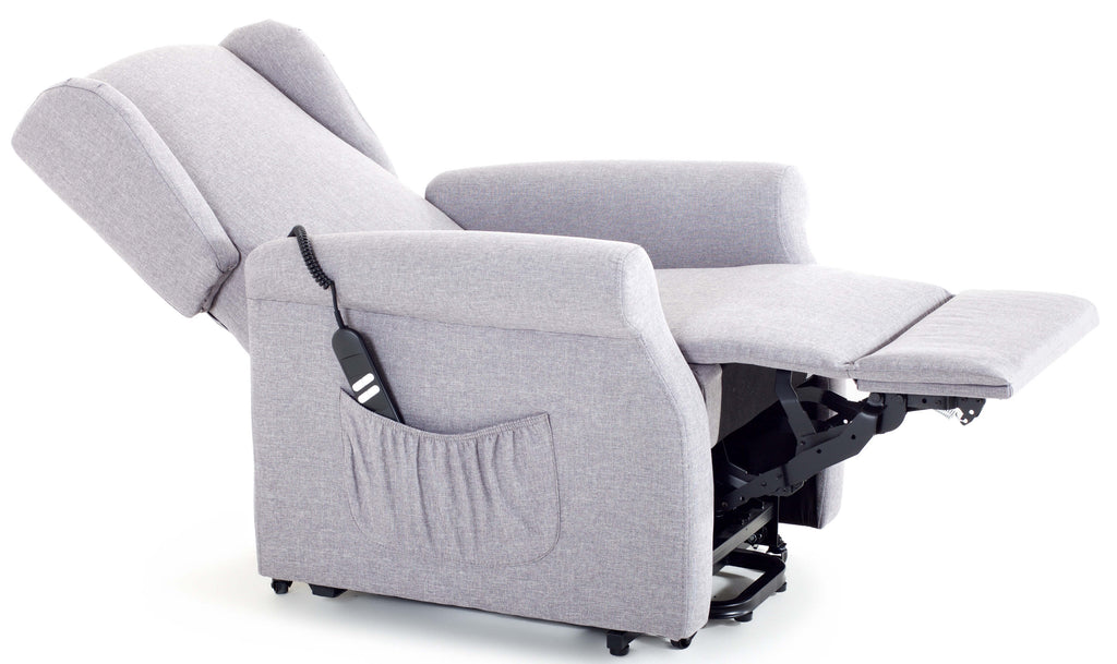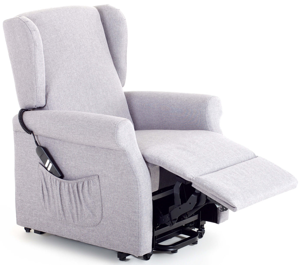 Fauteuil relax avec système élévateur et inclinaison indépendant avec structure en bois de sapin et contreplaqué, rembourrage en mousse de polyuréthane, revêtement en tissu gris, appui-tête "Riposo". Le fauteuil est doté d'un double moteur électrique avec mécanisme de levage (LIFT) et d'inclinaison indépendante du dossier et du repose-pieds, actionnable avec une télécommande. Le moteur Lift vous permet de régler indépendamment l'inclinaison du repose-pieds jusqu'à ce que le fauteuil soit complètement relevé en a) Position Lift. Le moteur d'inclinaison indépendant vous permet de régler l'inclinaison du dossier grâce auquel il est possible d'adopter la position b) Relax Bed.