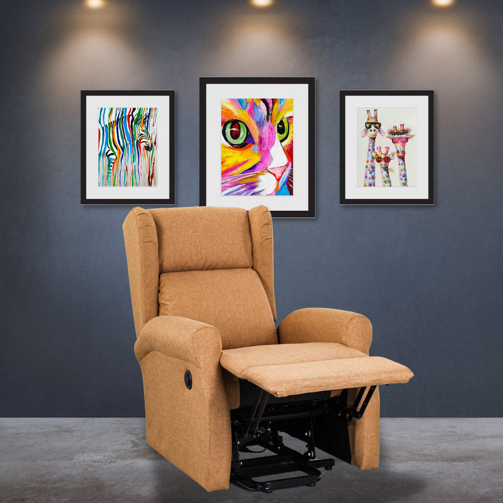 Modèle de fauteuil relax électrique moderne et élégant en tissu. C'est un produit unique et irremplaçable. Dossier enveloppant pour une assise composée, confortable et détendue. Rembourrage en tissu de qualité facilement lavable. Structure solide qui rend le fauteuil robuste et résistant à tout poids.