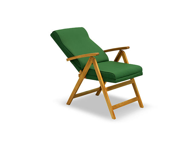 Fauteuil pliant à 5 positions, avec accoudoirs et coussin rembourré, bois d'acacia, tissu polyester hydrofuge vert uni, cm 75 X 60 X h 105