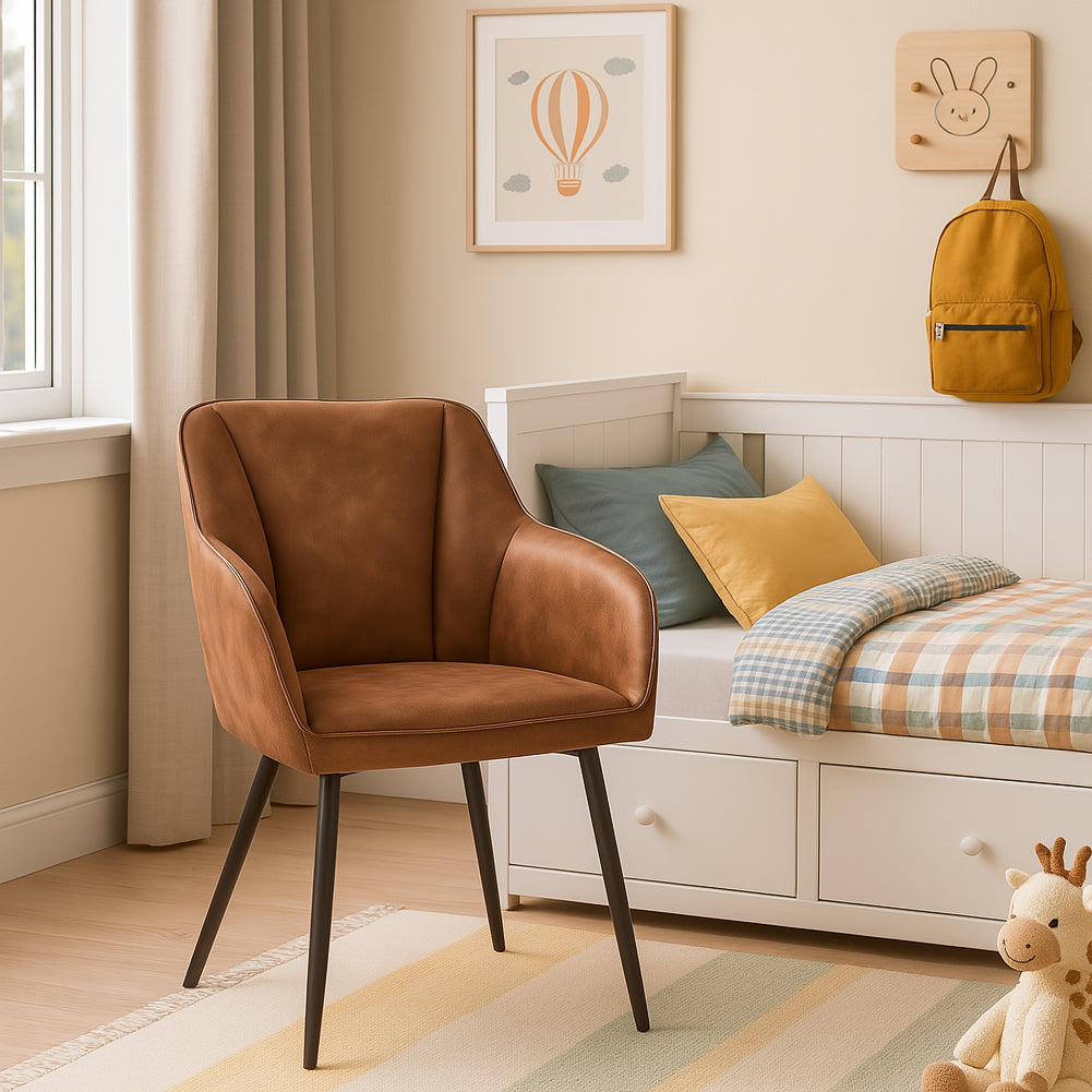 Il rivestimento in microfibra effetto scamosciato marrone aggiunge un tocco di calore e raffinatezza a qualsiasi ambiente, mentre la struttura in metallo verniciato a polvere nero garantisce robustezza e stabilità nel tempo. Le gambe in tubo di metallo completano il look moderno e minimalista.