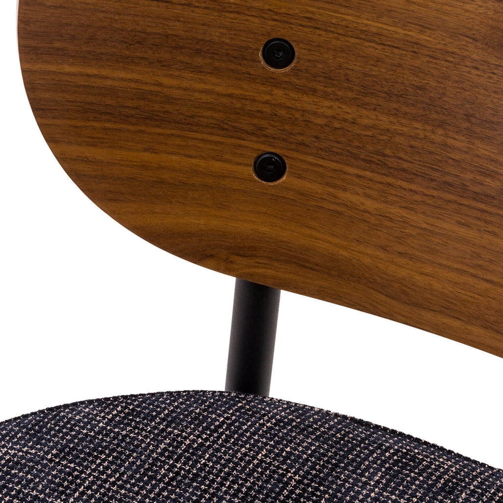 Fauteuil Ora Nera en tissu a/stain. Structure en métal tubulaire avec revêtement en poudre noir, assise avec rembourrage en polyuréthane haute densité et revêtement en tissu, dossier en bois finition chêne moyen.