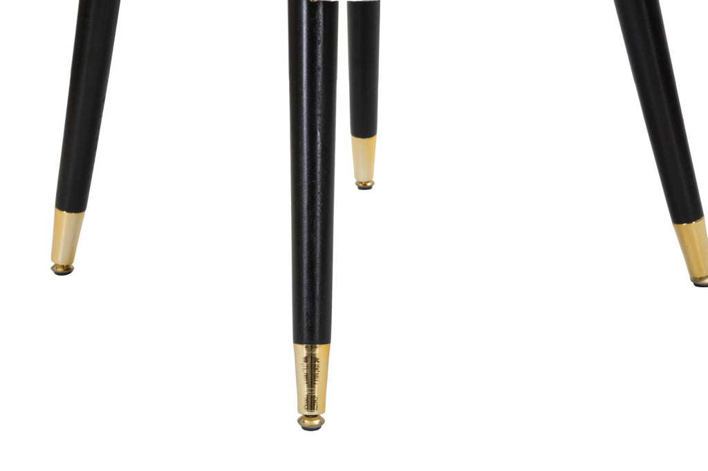 Fauteuil rembourré en tissu gris avec garniture dorée et pieds en bois noir avec détails dorés. L'élégance du noir et de l'or combinée pour offrir une détente confortable.