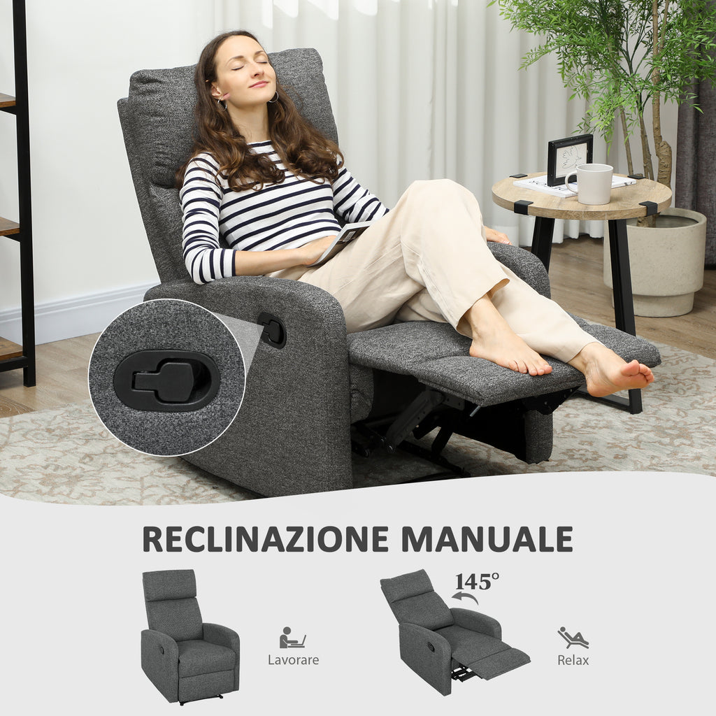 - STRUTTURA RECLINABILE: Reclina questa poltrona da soggiorno fino a 145° mediante controllo manuale e goditi un riposo meritato Per alzarti, è sufficiente premere con le gambe o i talloni per ritirare il poggiapiedi con fluidità