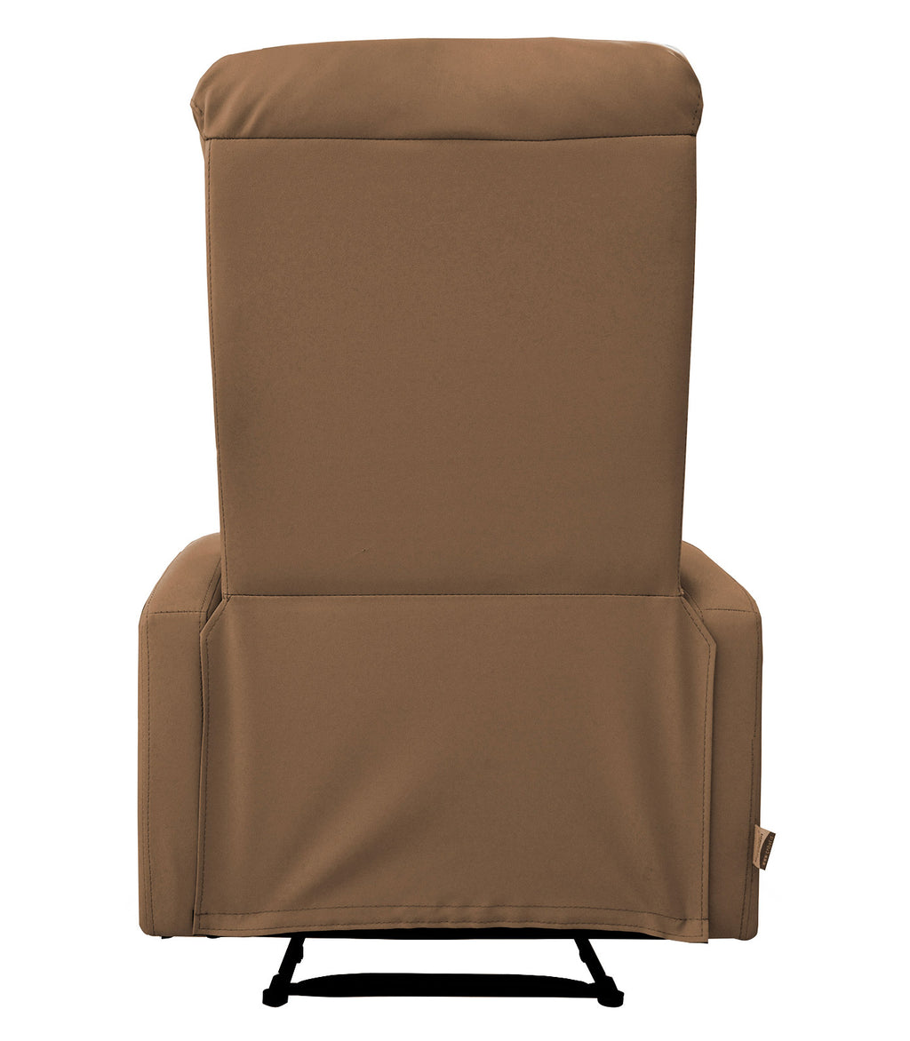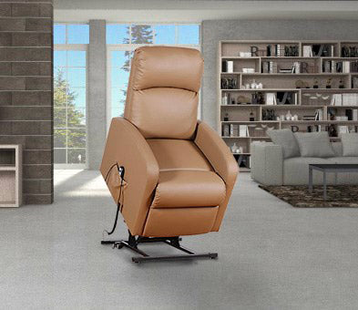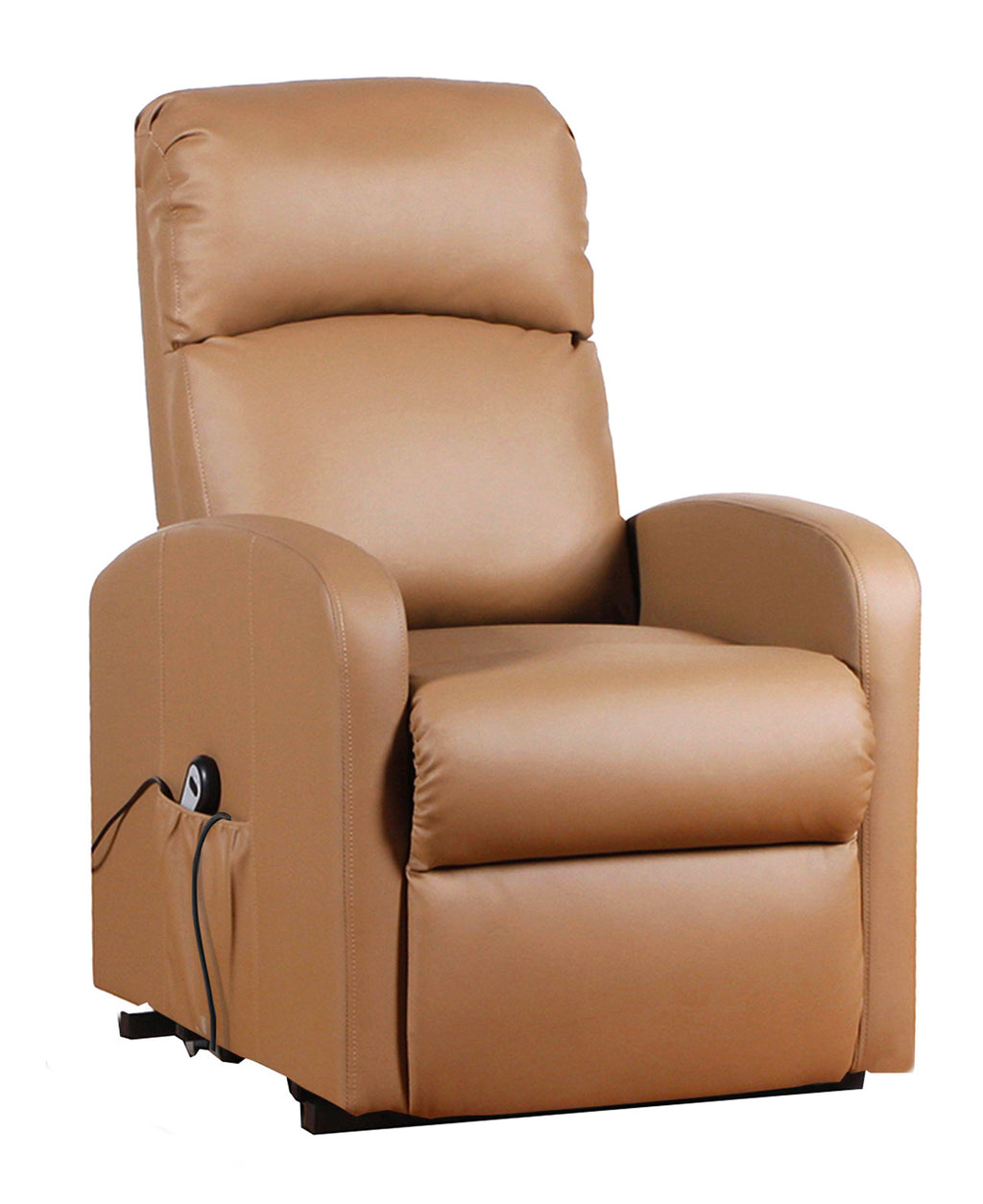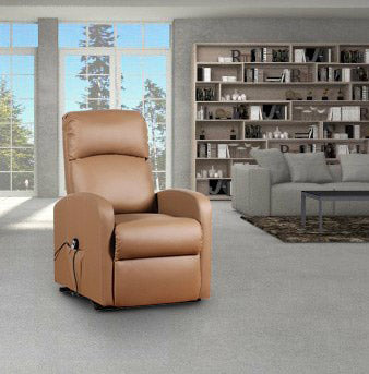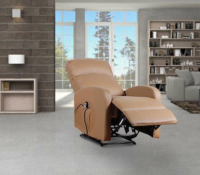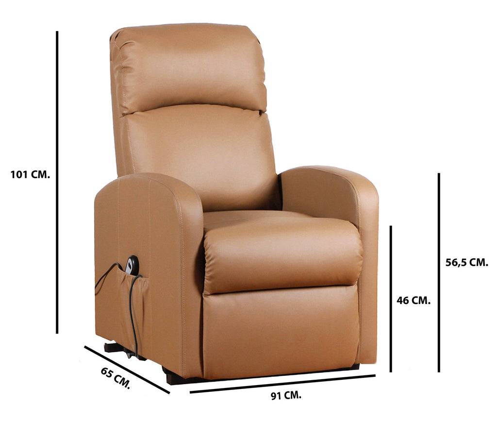 Fauteuil inclinable avec fonction relevable. Le mécanisme d'inclinaison du dossier avec relèvement simultané du pied de lit est électrique et est géré par une télécommande qui peut être rangée dans la poche appropriée positionnée sur le côté extérieur de l'accoudoir droit, tandis qu'une deuxième télécommande gère la fonction massante du dossier. Toute la structure du fauteuil, en bois et métal tubulaire, est rembourrée de feuilles de polyuréthane. L'assise et le dossier sont rembourrés de polyuréthane haute densité. Le revêtement de l'ensemble du fauteuil est en simili cuir boue.
