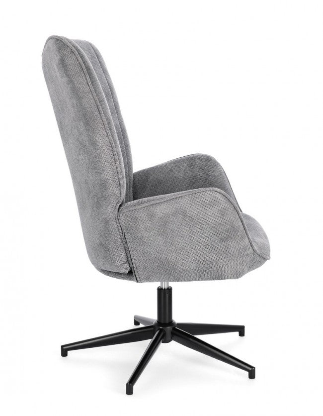 - Poltrona soggiorno in tessuto grigio con struttura e gambe in acciaio verniciate