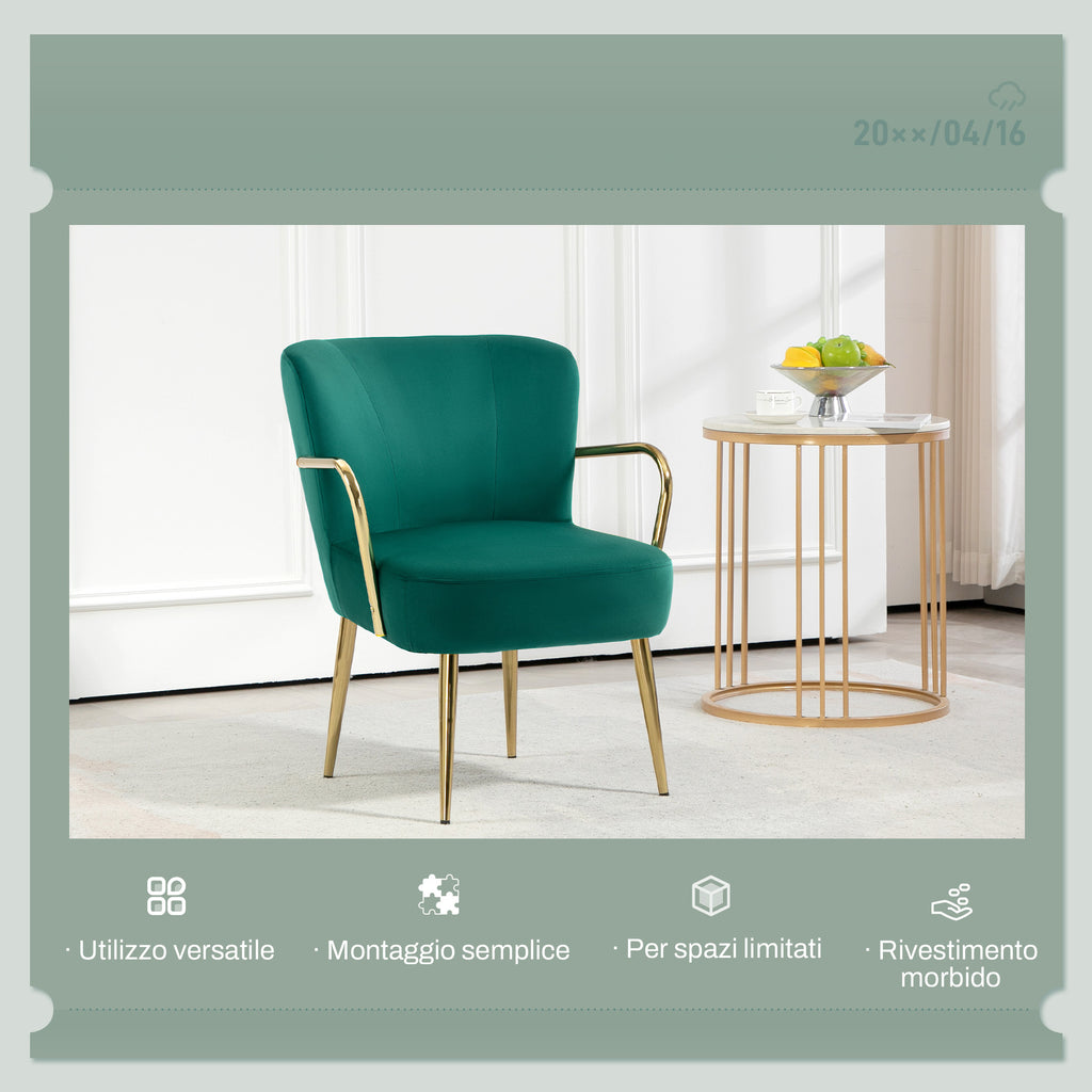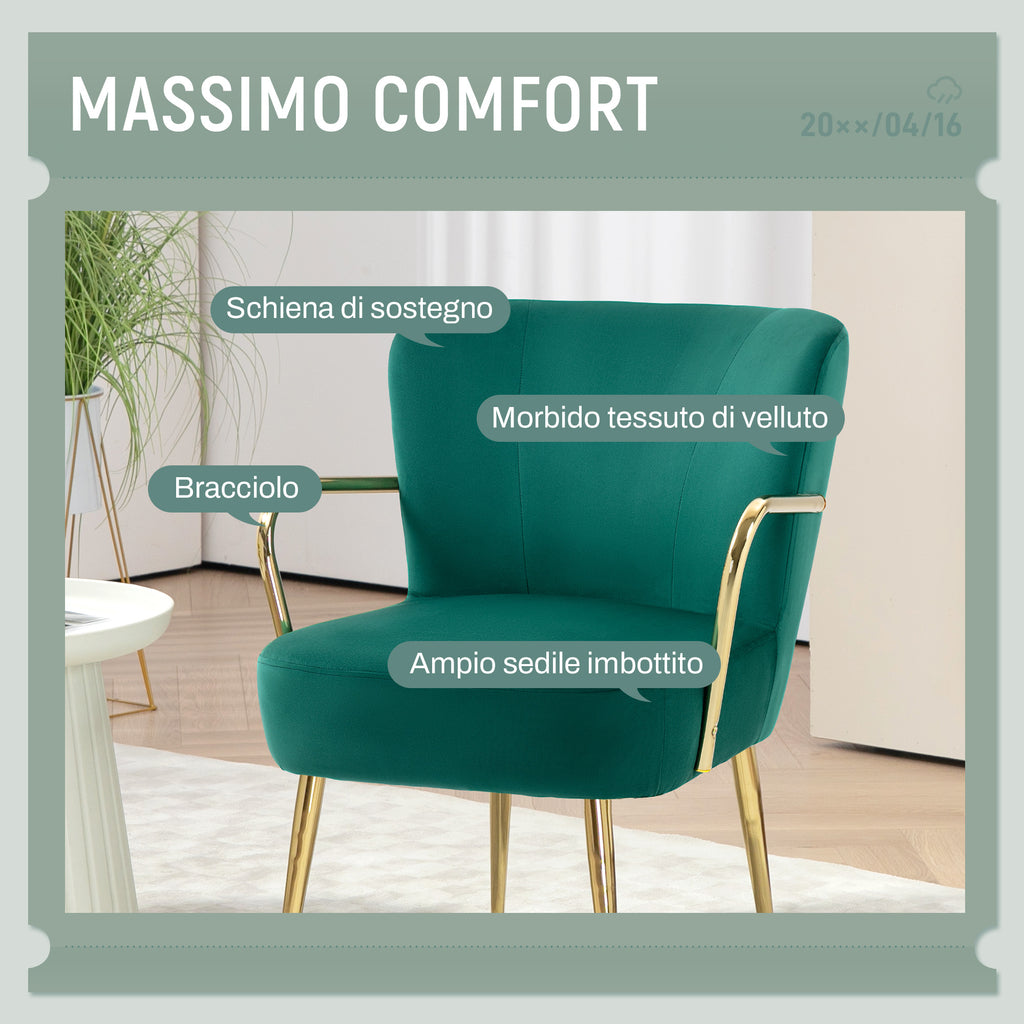 Poltrona Stile Retrò Braccioli e Gambe Dorate in Velluto Verde